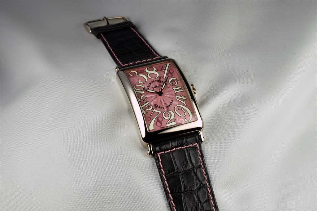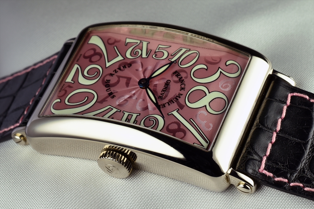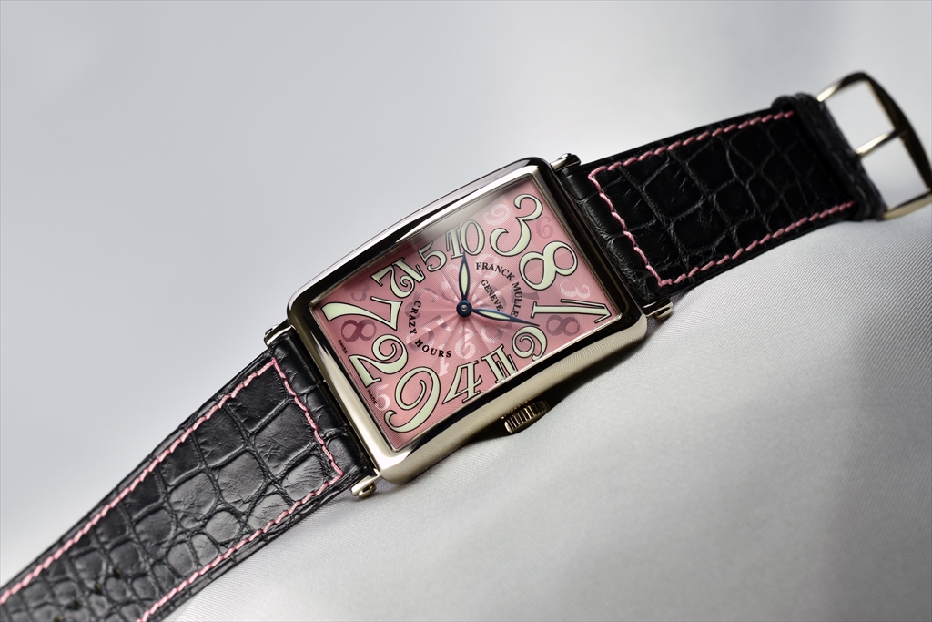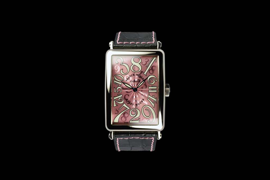 1200CH OG "ロングアイランド クレイジーアワーズ" です。本作品は2003年の発表と共に時計の歴史に金字塔を立てた「クレイジーアワーズ」です。時計は何千年もの前から研究され、その中でも腕時計の歴史は約100年程といわれています。しかしながら歴代の時計師達が長年積み重ねてきた歴史において時間がバラバラに表示された時計はフランク ミュラーの作品を除きこれまで見ることはありませんでした。フランク ミュラーはこの歴史的な芸術品を"時"に纏わるフランク流の哲学を伝える為に創作し、腕時計の価値は設計の複雑さや見た目の華やかさが全てではないと考えています。