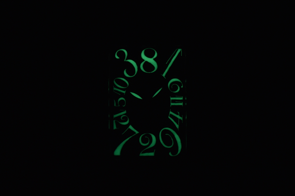 威風堂々とした大振りのレクタンギュラーケースの中には、メンズモデルとしては非常に珍しいパステルピンクをベースにして透かし彫りのビザン数字が何層にも重なるように散りばめらており、2次元であるはずの文字盤にあたかも深い奥行が存在するかのような錯覚さえおぼえます。色鮮やかな文字盤が、複雑機構を搭載したクレイジーアワーズにデザイン的な深みを加えています。