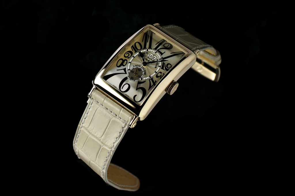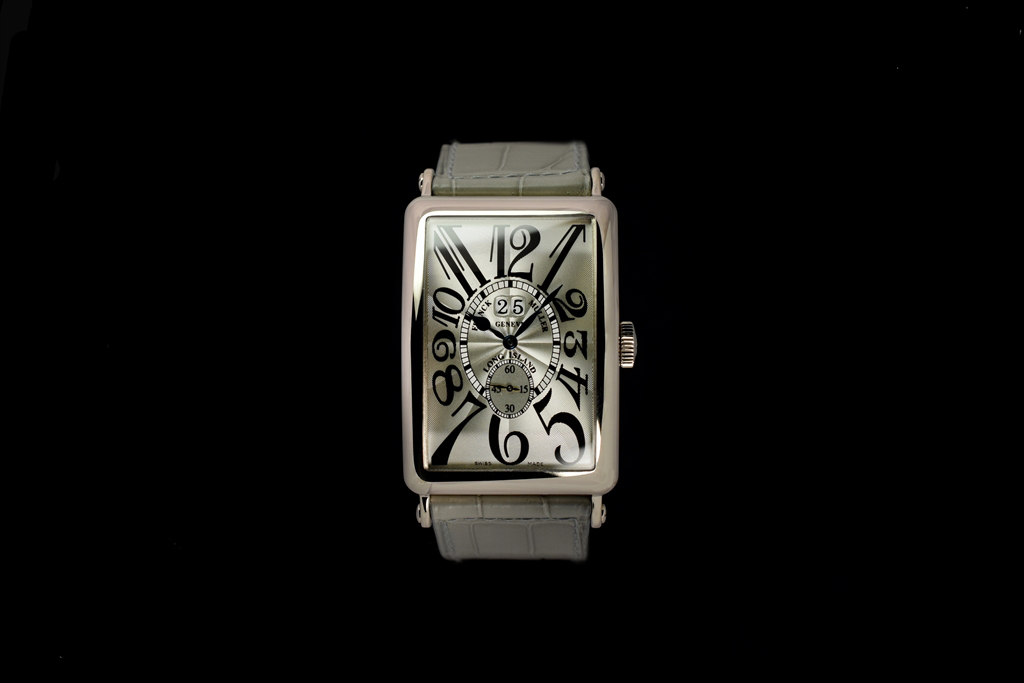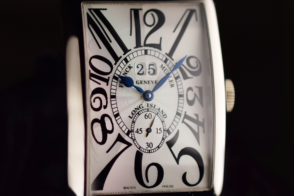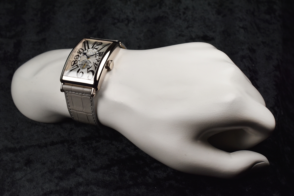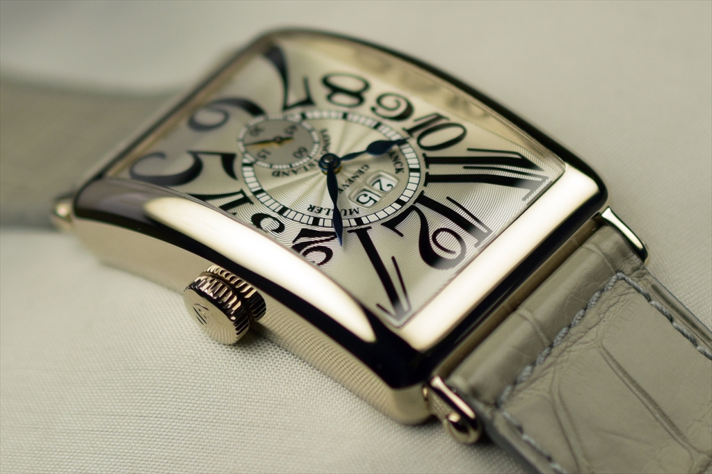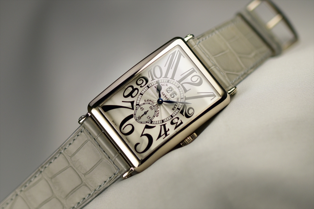 そしてこの機構が搭載されたロングアイランド ケースは、1920年〜1930年代のアール・デコ様式を忠実に具現化したフォルムをもっています。表面的には直線のケースでありながら、上下に大きく湾曲させ、直線と曲線の絶妙な組合せによって構成されています。人工的で硬質なイメージのレクタンギュラー(長方形)は、まるで建築物のように雄大です。それでいて、ひとたび角度を変えると、まるでたった今溶け出したかのようにやわらかく湾曲し、曲線と曲線だけで構成された自然物や生き物の姿ようでもあります。直線を軸に放射状にデフォルメされたビザン数字との組合せは、まさにアール・デコモダーンにフランク ミュラー独自の表現が込められた美しいデザインの名作時計です。