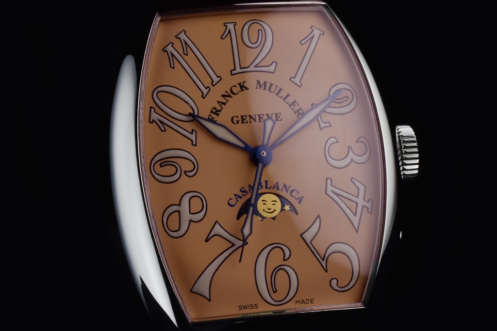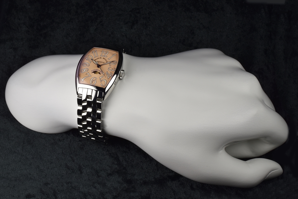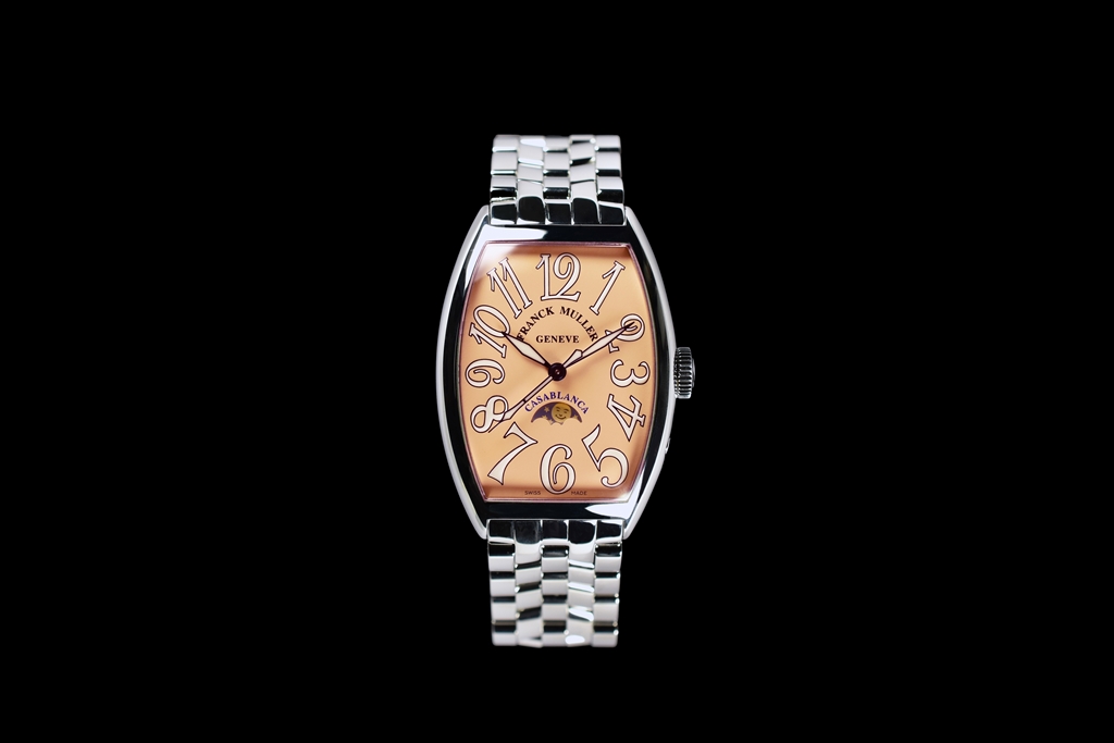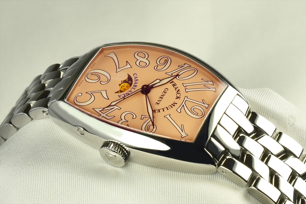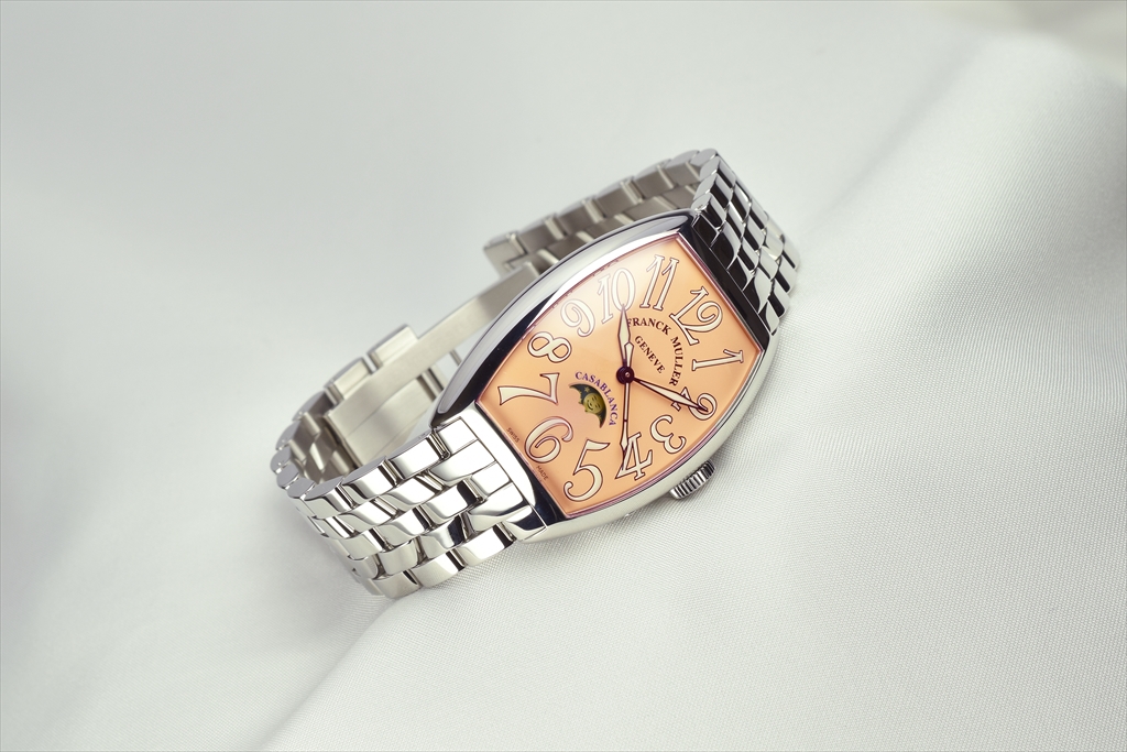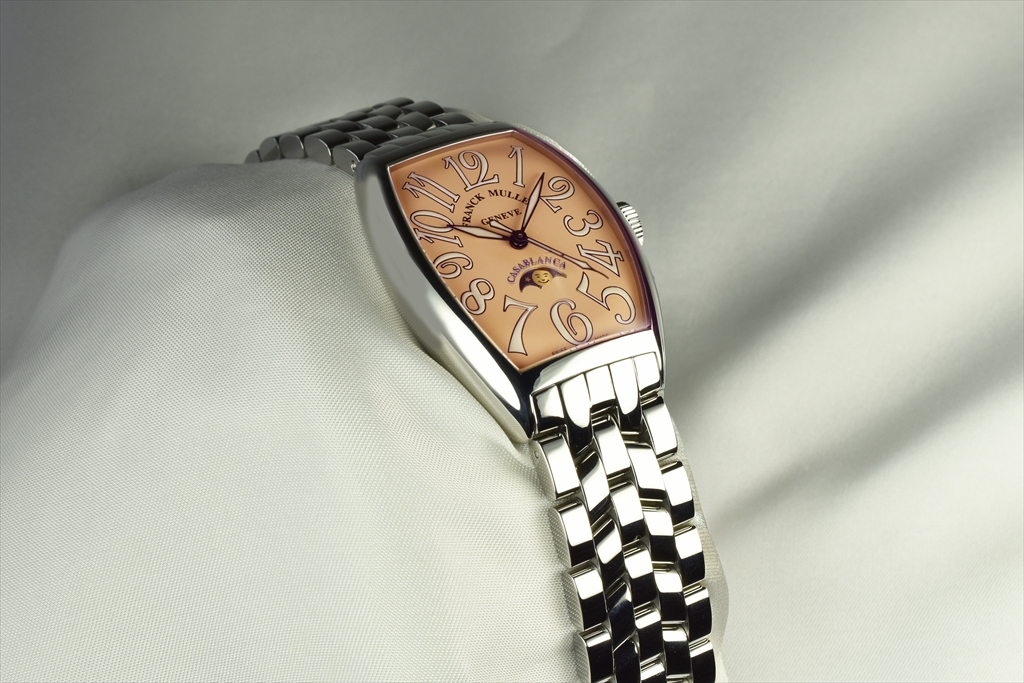 5850CL OAC "カサブランカ ルナ サーモン" です。トノウ カーベックス カサブランカは、フランク ミュラーのブランド黎明期である1994年に発表され、以来20年以上もかわることなく作り続けられるロングセラーであり、名作と呼び声の高いコレクションです。