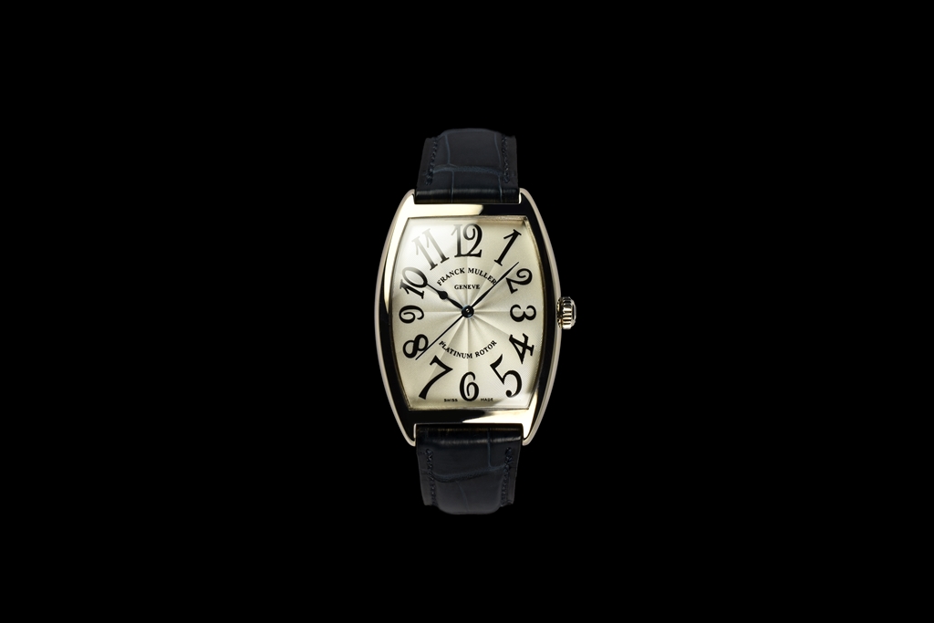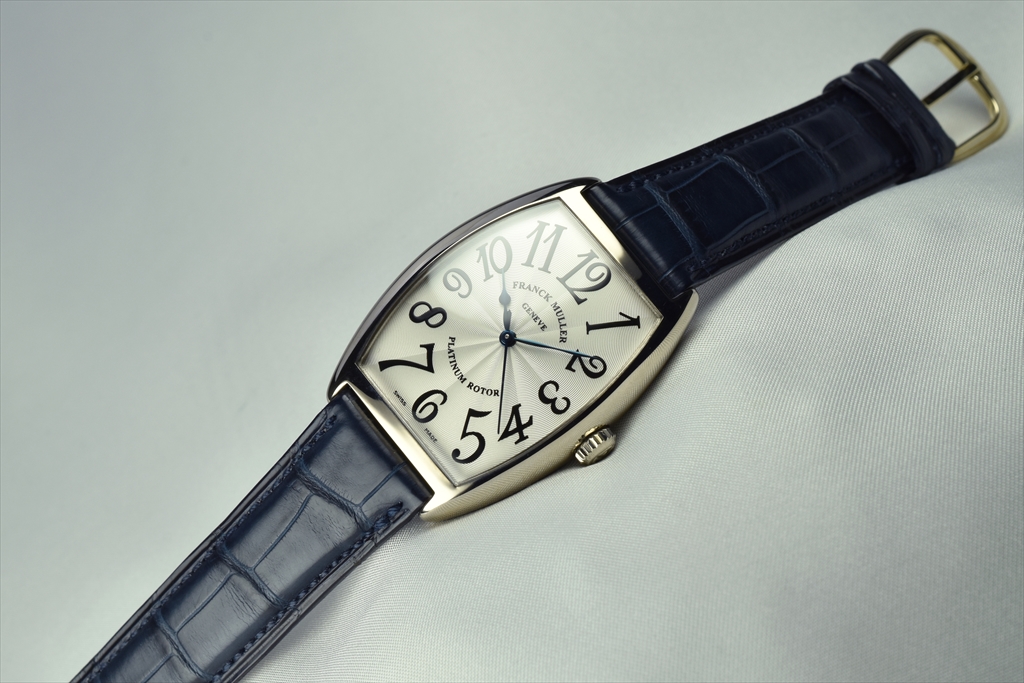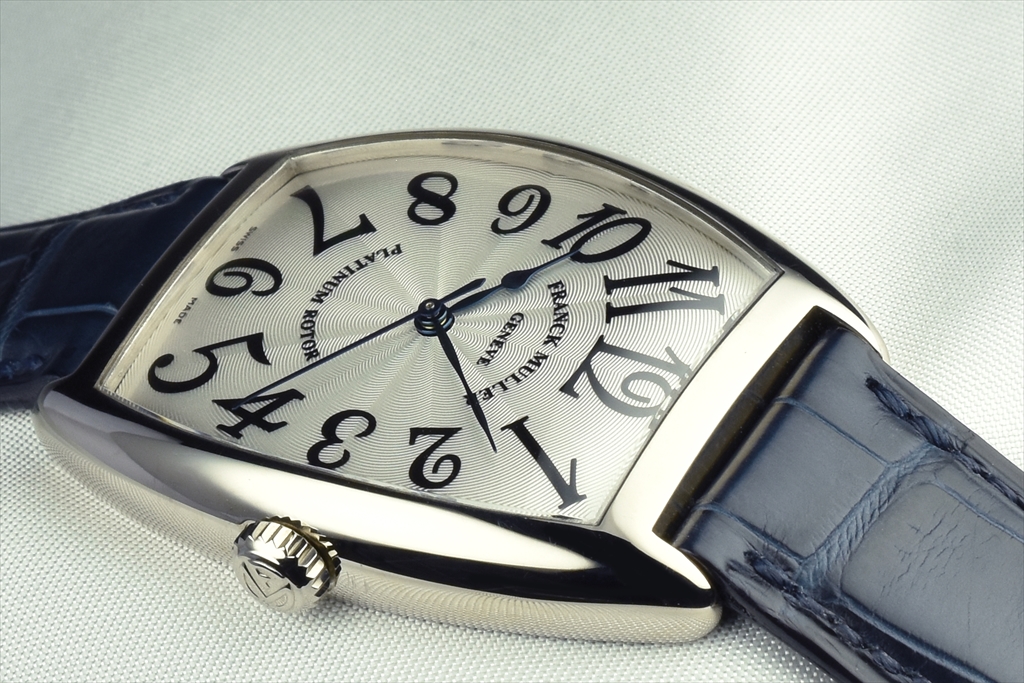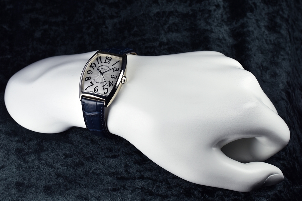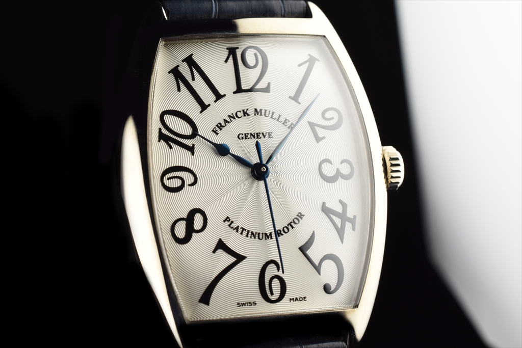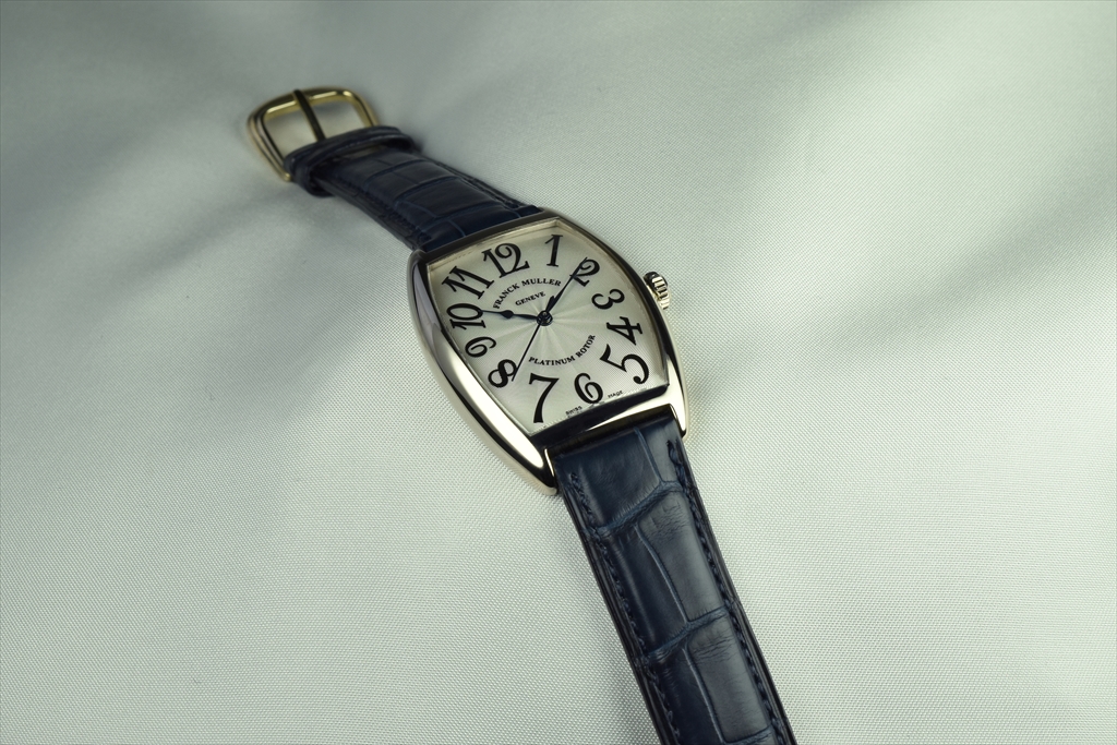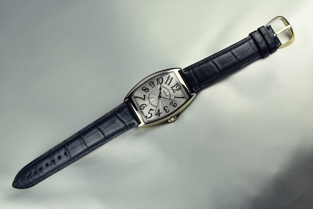 こちらのお品は、初期に生産された個体となり、ダイアルの仕様が現在の同モデルに比べて文字のレタリングが小さくより繊細な印象があります。ギョウシェが入った白の文字盤の上に配置された華奢なビザン数字のインデックスと、繊細なラインのスペード針が上品さを醸し出しており、まさにフランク ミュラーの代表的作品です。