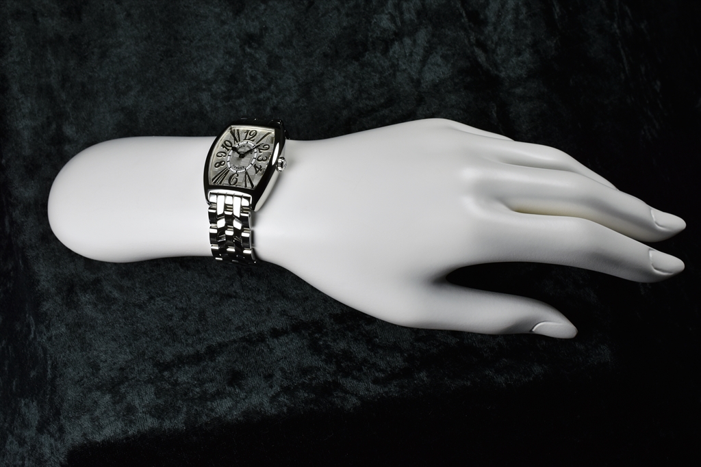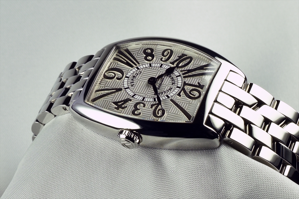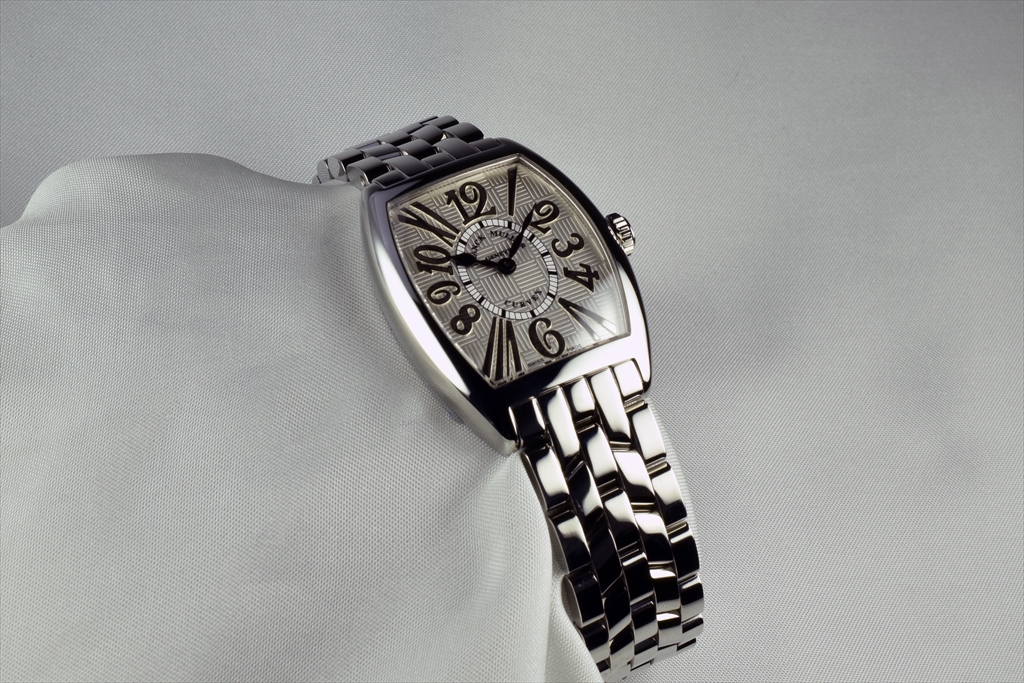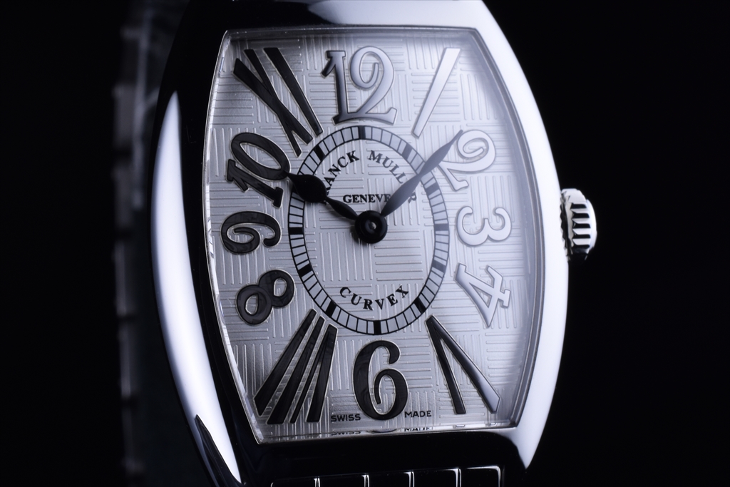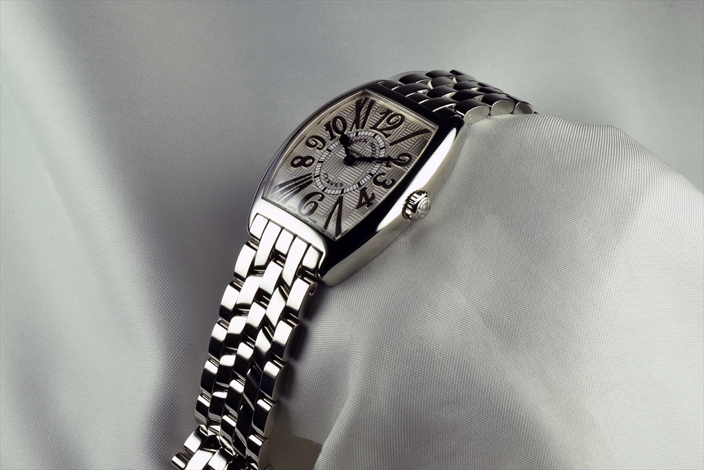 前作に引き続き文字盤には格子状の模様が施され、インデックスにはフランク ミュラーのアイコンともいえるビザン数字と放射状にデフォルメされた独特のローマ数字が融合され、連続性のなかに美しいリズムを醸し出しています。