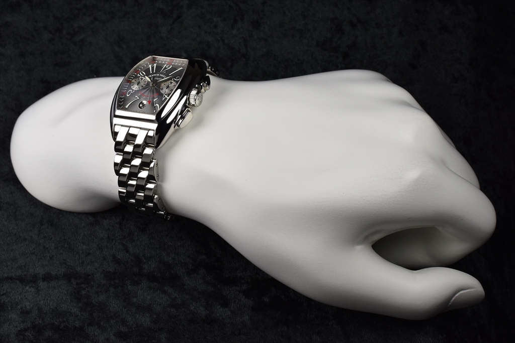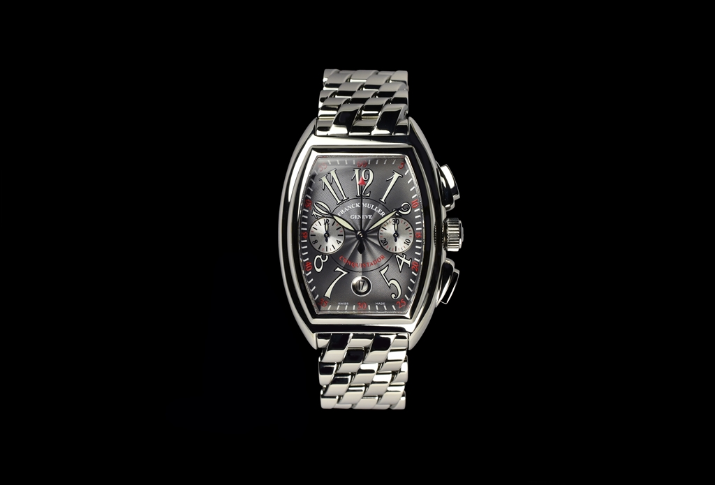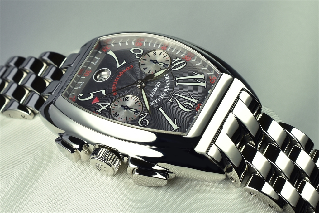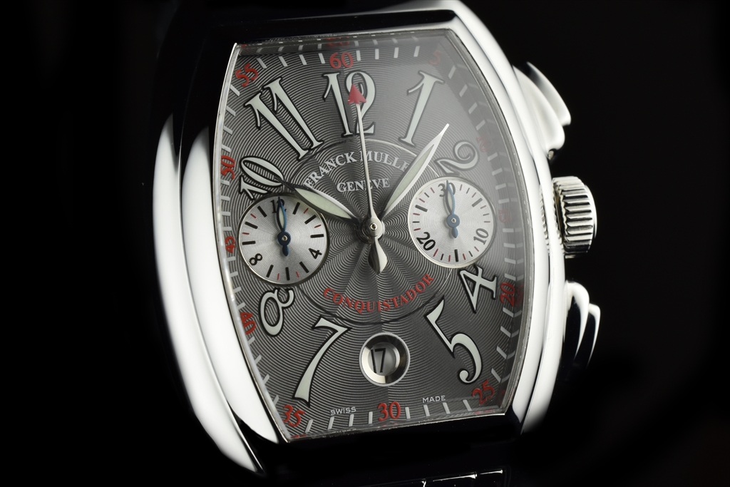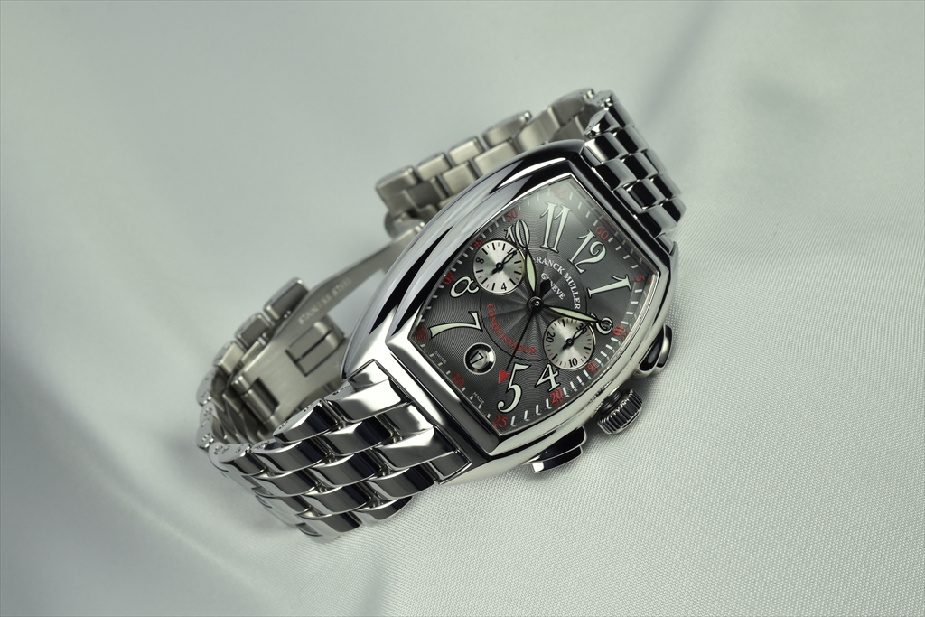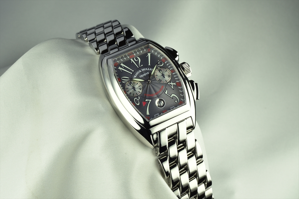 8005CC OAC Gray "コンキスタドール クロノグラフ" です。1998年に発表されフランク ミュラーの代表作ともいえるコンキスタドール。立体的な独特のトノウ ケースは、従来のトノウ カーベックスのクラシカルなラインとは対照的に近未来的なダイナミズムを感じさせる迫力のあるフォルムで、他のどんな腕時計にもないフィット感で、繊細さを残しながらも、頑強なリストウォッチにふさわしい意志の強さを感じさせます。