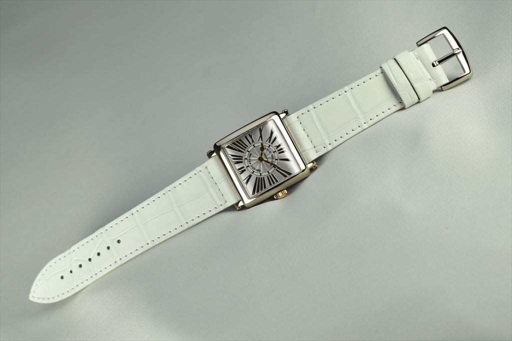 6002SQZRRELG OG "マスタースクエア レディース リミテッド" です。アールデコ様式からインスピレーションを得た「マスタースクエア」はロングアイランドと同様に直線と曲線をモチーフにしたコレクションです。まるで額縁を思わせる正方形のケースいっぱいに、中心部から放射線状にデフォルメされた独特のローマ数字が伸びやかに描かれています。