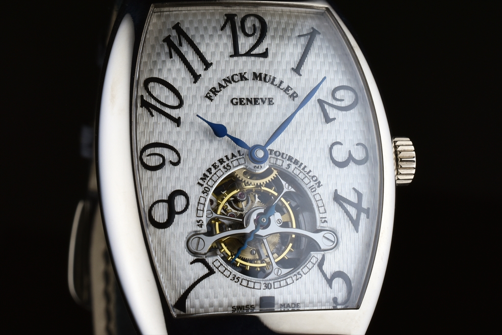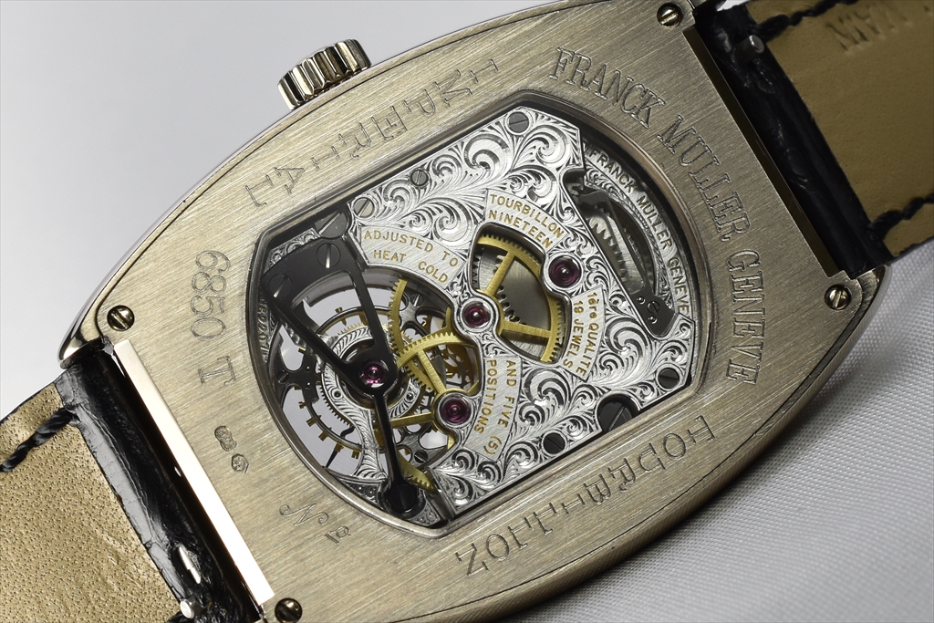 インペリアル トゥールビヨンと名付けられたこのモデルは、かつて、アジアの王侯貴族が懐中時計のトゥールビヨンを持っていましたが、その複雑さとデリケートな機構が故、よく故障を起こしたことから、『この時計には悪魔が憑いている』と不吉な時計だと嫌ったという言い伝えがありました。その逸話にヒントを得たフランク ミュラーがこの"インペリアル・トゥールビヨン"を作りました。当然のことながら故障が少ないトゥールビヨンを開発する技術は、そもそもフランク・ミュラーのお家芸でもありますが、このモデルでは、トゥールビヨンの天符(テンプ)を納めるケージ(籠)を、前後6本の剣に模し、それを常時回転させることで、内部に侵入しようとする悪魔から天符を守る役割としたのです。これは同時に時計の心臓部である天符を人の"生命"にたとえ、この時計を持つオーナーに降りかかるべく災いから救われるようにと、元来の精度を追求する為の装置に留まらず いわゆる"魔除け"や"お守り"といった物として、その作品に信心的な意味合いを持たせています。 そして本品のムーヴメントには手彫りによる"エングレイブ"が施され、シースルーバックから繊細で美しい彫刻を眺めることが出来ます。まさにこちらのスペシャルピースは、その名のとおり"皇帝のトゥールビヨン"なのです。