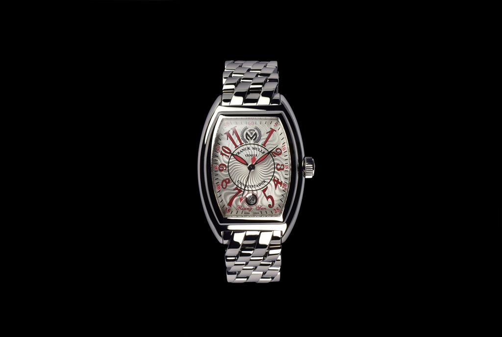 8005HSCRSUN OAC "コンキスタドール ライジングサン" です。1998年に発表されたコンキスタドールコレクション。立体的な独特のトノウケースは近未来的なダイナミズムを感じさせる迫力のあるフォルムで繊細さを残しながらも、頑強なリストウォッチにふさわしい意志の強さを感じさせます。モデル名の「コンキスタドール」は16世紀に名を馳せたスペイン人の征服者に由来しています。21世紀の現代に新たなる時の征服者を志すフランク ミュラーならではの力強いネーミングといえるでしょう。このネーミングには、未だに踏み込んでいない、新たな時代へ進化するという意味が込められ、同時に、新しい次元を目指す力強い意志まで感じさせます。