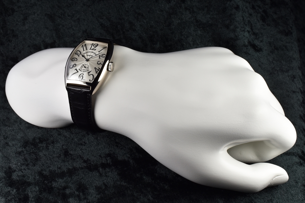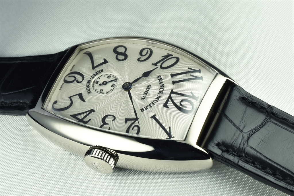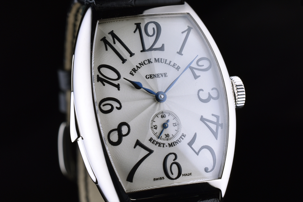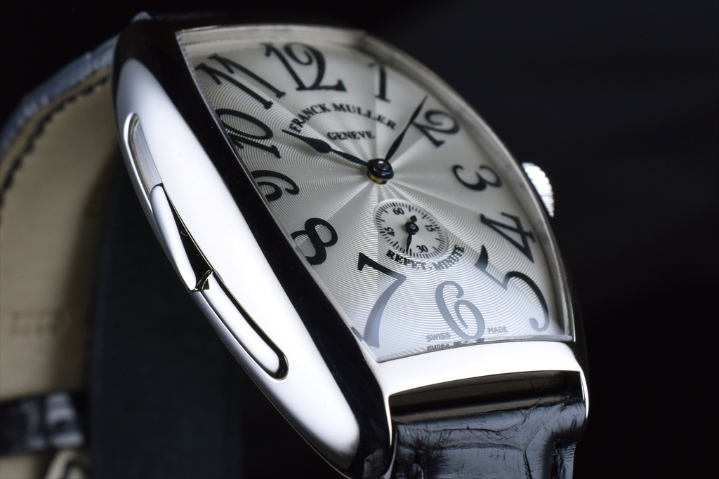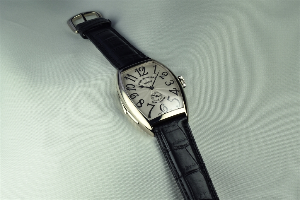 本品はそんな腕時計のミニッツリピーターの中でも更に特質すべき点があります。なんとムーブメントの大きさが直径22mmと極小であることに加え、オートマティック(自動巻き)として完結させているところにあります。 フランク ミュラーとしてもこのモデルの製作本数は極めて少なく、これまで日本での販売履歴もたった2本のみとなっています。(WGとYG各1本)これはその内の1本となり、シリアルナンバーも通常はメーカー所蔵を意味する"00"が刻印されています。そして内部の複雑さとは裏腹に文字盤上のデザインは極めてシンプルに仕上げられ、9時側のレバーの存在がなければ、通常のスモールセコンドのモデルと何ら変わる容姿を表していません。自動巻き機能としている事からも、「リピーターという超複雑時計をさりげなく日常使いとしてほしい」という、フランク ミュラー氏の"粋"な配慮が伝わってくるようなモデルです。シースルーバックの裏側からは、繊細に手彫りされたイングレーブ仕上げのムーブメントの中に、リピーターの巧みな動きを観賞する事が出来ます。