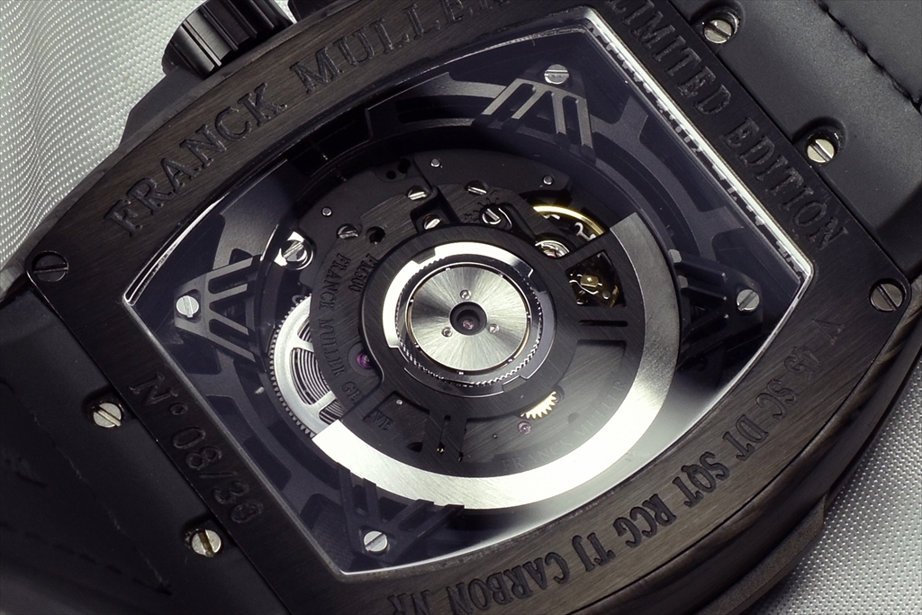 フランク ミュラー ウォッチランドで再構築されたムーブメントは、スポーツカーのエンジンを彷彿とさせるフレーム構造をデザインに落とし込み、自動巻き式ムーブメントと組み合わされることでF1さながらの美しいメカニズムが堪能できます。