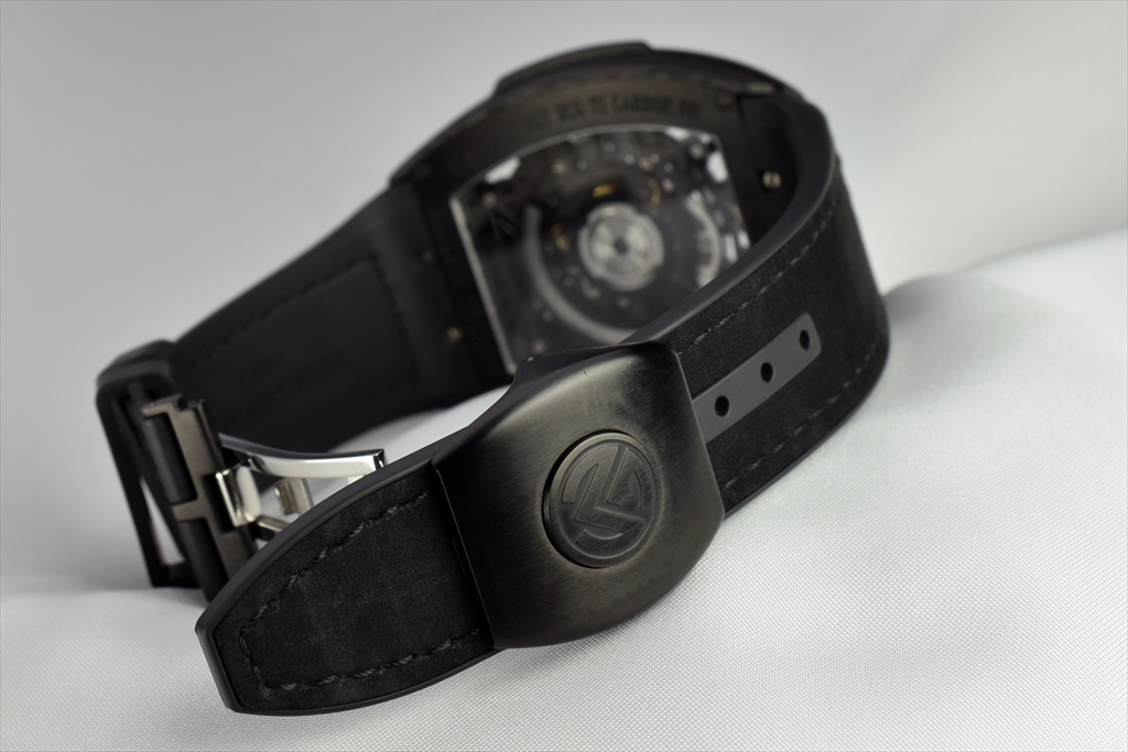 ストラップは通常のバネ棒ではなく2つの隠しネジによってケースに取り付けられています。ストラップの裏面にはラバーを採用し、手首の形状にしっくりと馴染み、快適性と人間工学を追求する一方で、表面はスポーツカーの運転席の内装を思わせる素材を採用しています。