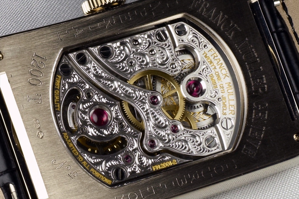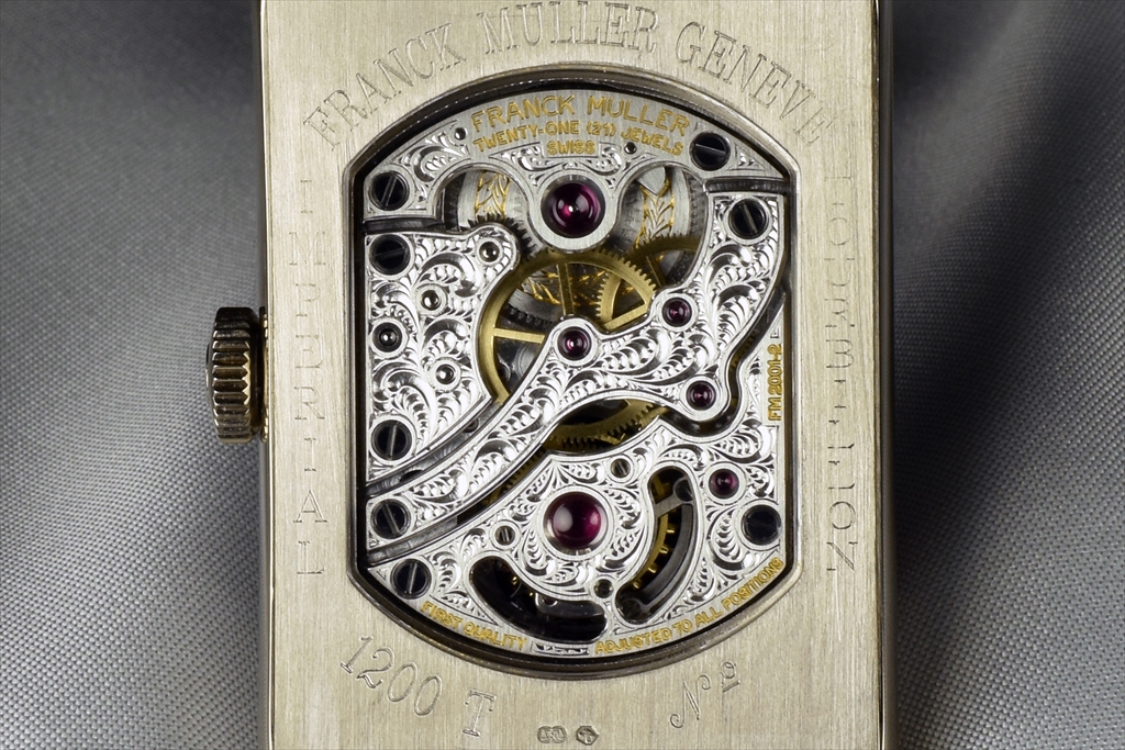 インペリアル トゥールビヨンと名付けられたこのモデルは、かつて、アジアの王侯貴族が懐中時計のトゥールビヨンを持っていましたが、その複雑さとデリケートな機構が故、よく故障を起こしたことから、『この時計には悪魔が憑いている』と不吉な時計だと嫌ったという言い伝えがありました。その逸話にヒントを得たフランク ミュラーがこの"インペリアル・トゥールビヨン"を作りました。当然のことながら故障が少ないトゥールビヨンを開発する技術は、そもそもフランク ミュラーのお家芸でもありますが、このモデルでは、トゥールビヨンの天符(テンプ)を納めるケージ(籠)を剣に模し、それを常時回転させることで、内部に侵入しようとする悪魔から天符を守る役割としたのです。これは同時に時計の心臓部である天符を人の"生命"にたとえ、この時計を持つオーナーに降りかかるべく災いから救われるようにと、元来の精度を追求する為の装置に留まらず いわゆる"魔除け"や"お守り"といった物として、その作品に信心的な意味合いを持たせています。 そして本品のムーヴメントには手彫りによる"エングレイブ"が施され、シースルーバックから繊細で美しい彫刻を眺めることが出来ます。まさにこちらのスペシャルピースは、その名のとおり"皇帝のトゥールビヨン"なのです。