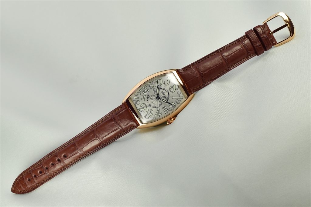 18Kピンクゴールドのケースと尾錠は新品同様の仕上げが施され、ストラップも新品に交換済みです。
