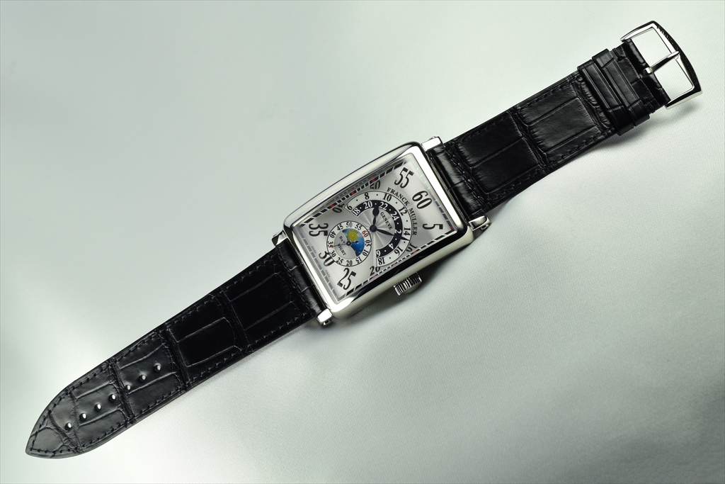 1300HRJN AC “ロングアイランド レトログラードアワー デイ&ナイト” です。フランク ミュラーの時計作りは、既成概念にとらわれない自由な発想で"時"というものの本質と向き会うところから始まります。一般的な時計では、一日24時間を12時間で表示するために、短針が2周して時間を表しています。ところが、私たちの実生活において、1日の中でも昼の3時と夜中の3時とでは、その過ごし方は大きく異なります。例えば、多くの人は1日の約半分を"公の時"として働き、あとの半分を"私の時"として余暇を過ごします。"昼"と"夜"それぞれを異なる意味の時間と考えるなら、必然的にそれを表現する時計も必要だと考えたのです。