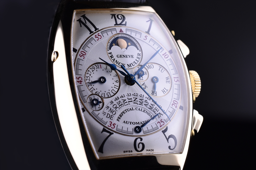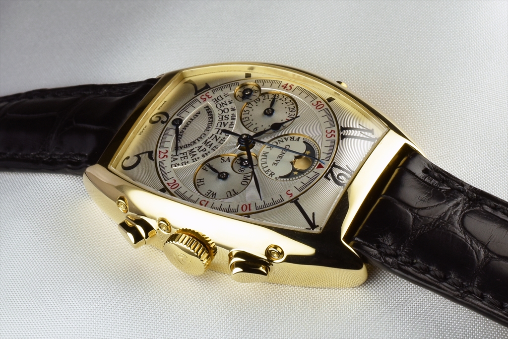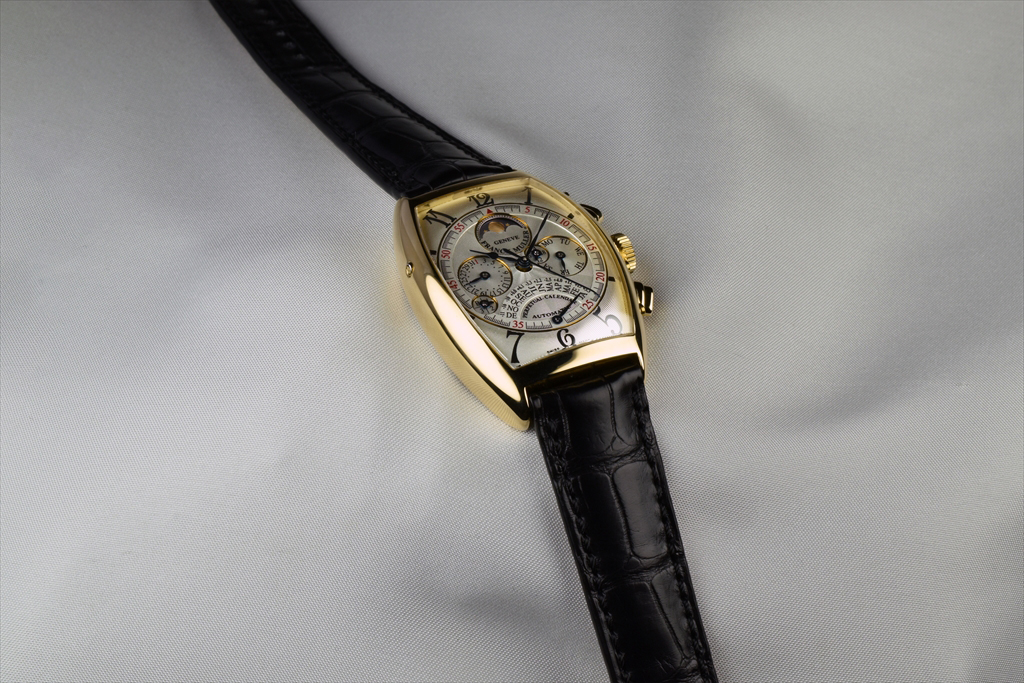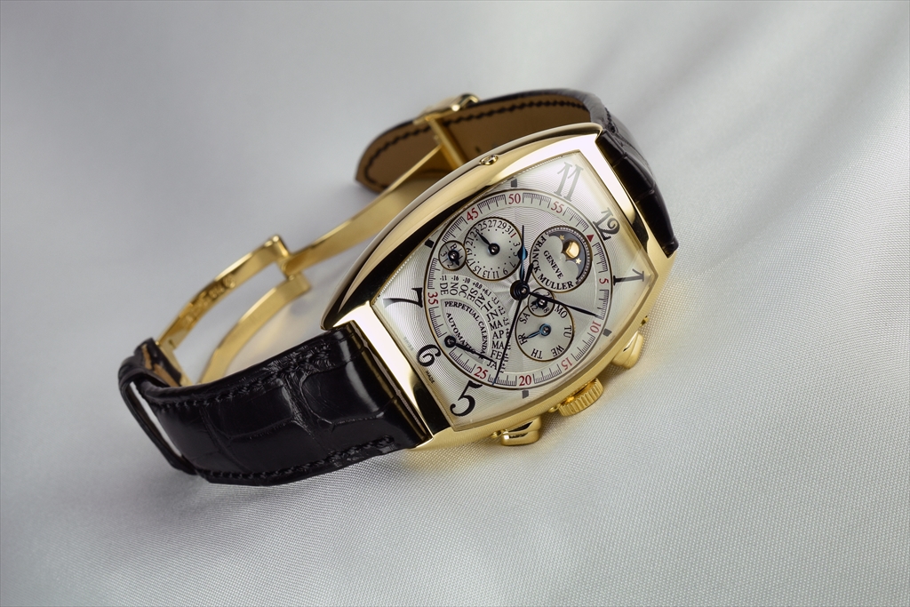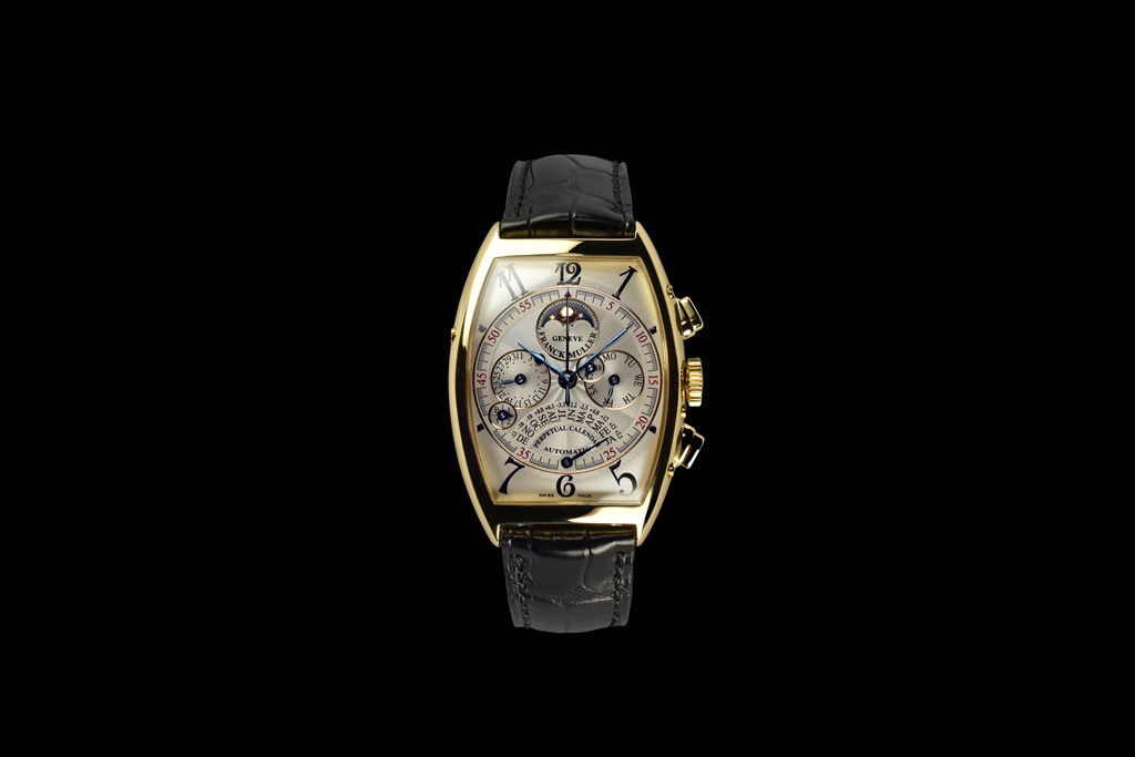 18Kイエローゴールドケースに白文字盤とブルースティール針という、古典的高級腕時計の王道ともいえる組み合わせのこの作品は、三次元曲線で構成されたカーベックスケースに納められたことで、より大胆でそしてクラシカルな趣を醸し出しています。重厚さの中に繊細さを持ち合わせ、これ以上手の加えようが無い程の完璧な黄金比を完成させています。発表以来稀代の名作として高い評価を受けている "6850QPE" は、『Master of Complications』を自任するFRANCK MULLERを代表する作品のひとつです。