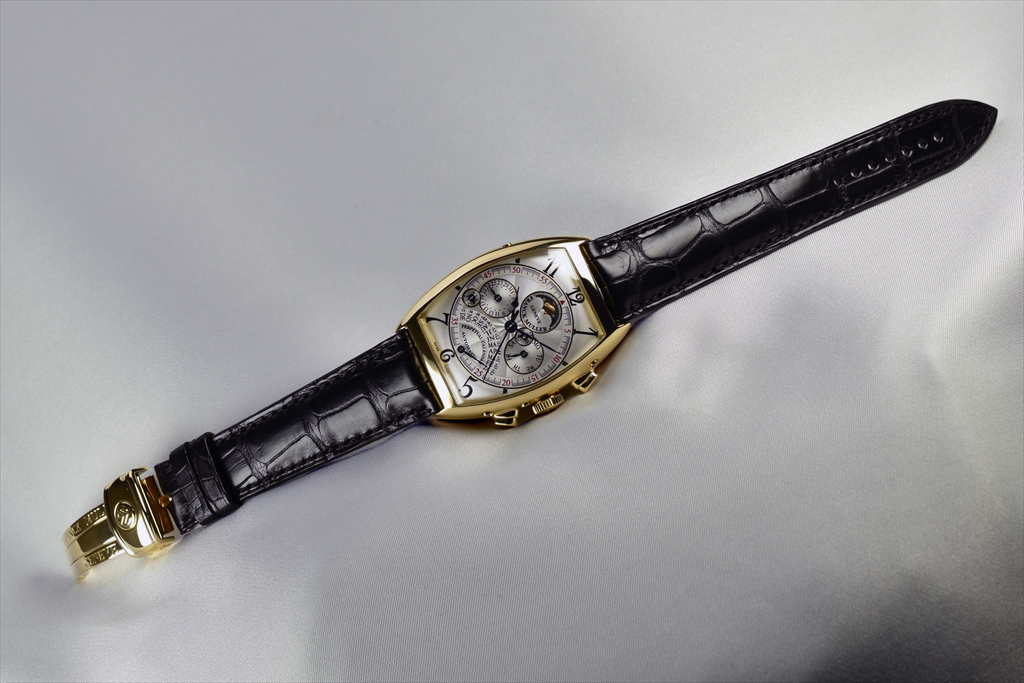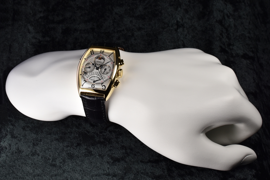 6850QPE 3N " トノウ・カーベックス パーペチュアルカレンダー クロノグラフ" です。1994年に発表されたラウンド パーペチュアル クロノの名作"7000QPE" を三次元曲線のトノウ カーベックス ケースとして製作されたモデルです。
