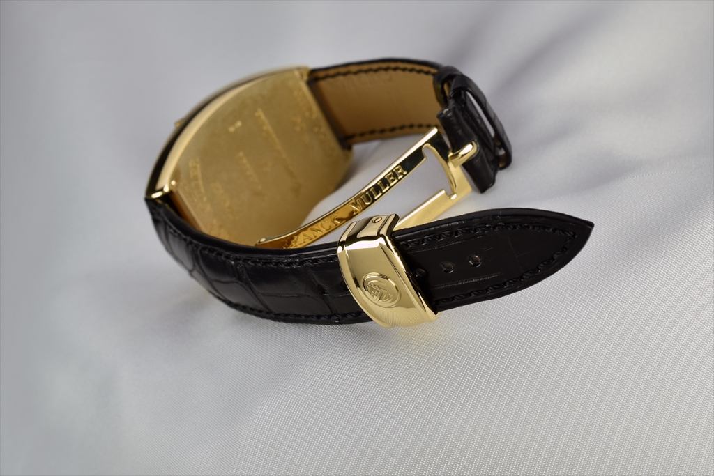 18KイエローゴールドのケースとDバックルには磨きが施され、新品同様の輝きを放っています。ストラップも新品に交換済みです。