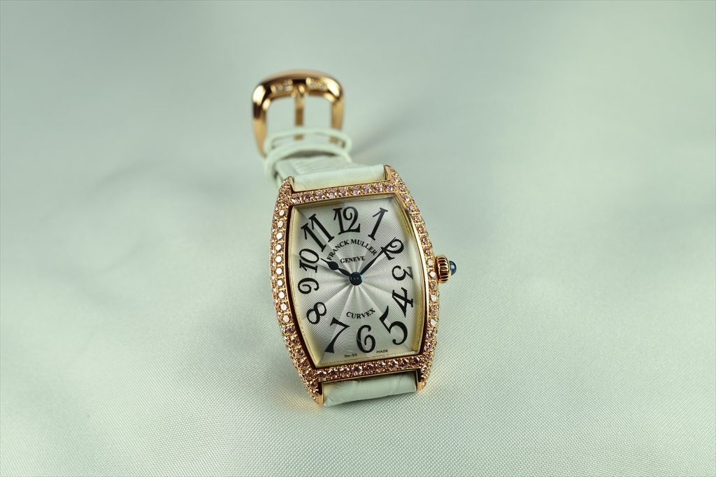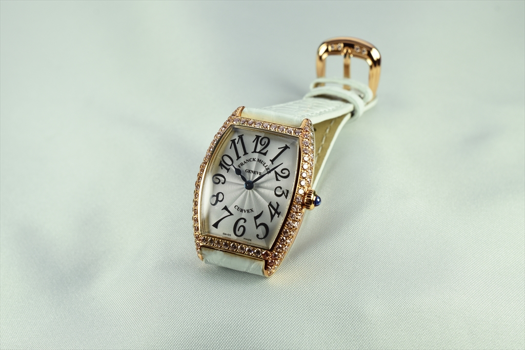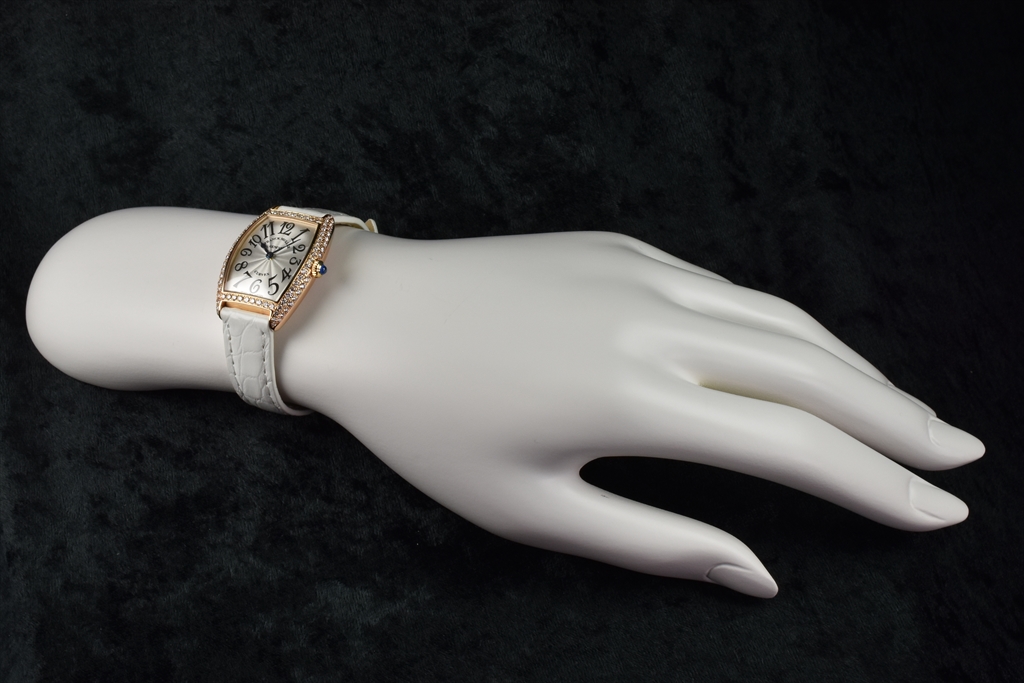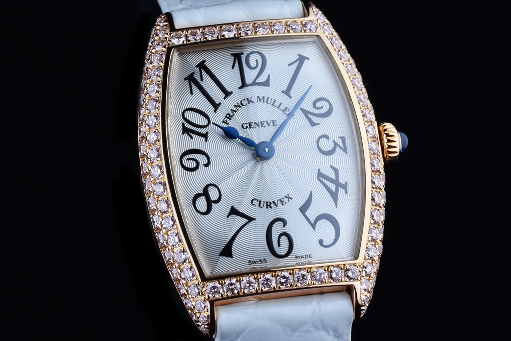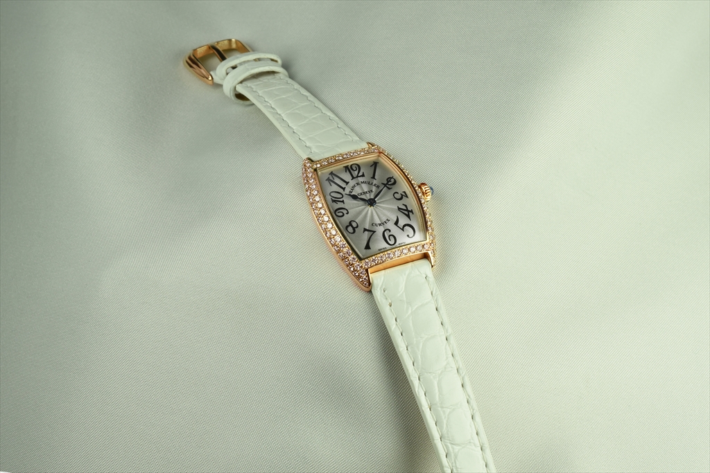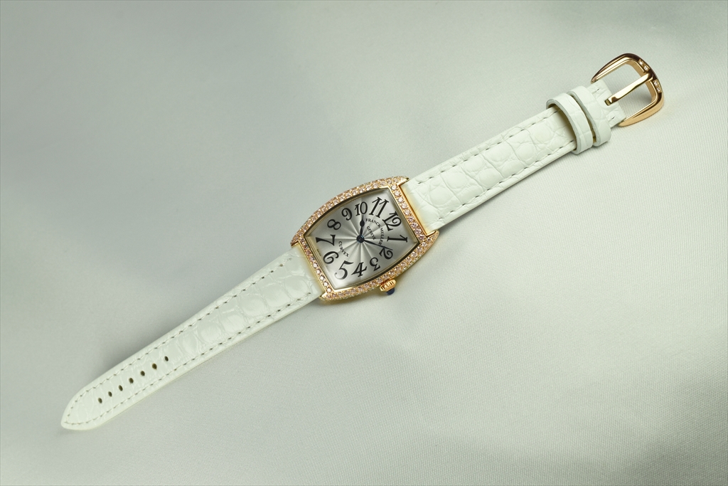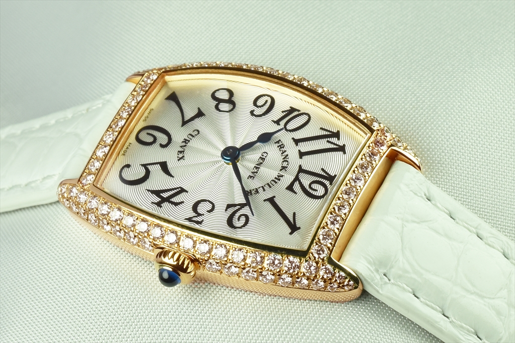 1752QZD 5N "トノウ・カーベックス レディース ダイヤモンド" です。ケース側面を2列のダイヤモンドで埋め尽くされた、トノウ カーベックス レディース ダイヤモンドです。特に厳選された"トップ ヴェッセルトン"(VVS)最高グレードのダイアだけを使用した大変美しいダイアモンド ウォッチです。 三次元曲線上のカーベックスケースに一流の宝飾職人の手作業によって、一粒 一粒入念にパヴェセッティングされ、眩いばかりの光が美しく弧を描き輝いています。2列にセットされたゴールドのケースにはダイヤモンドが贅沢にセッティングされカーベックスの曲線美をより一層際立たせています。