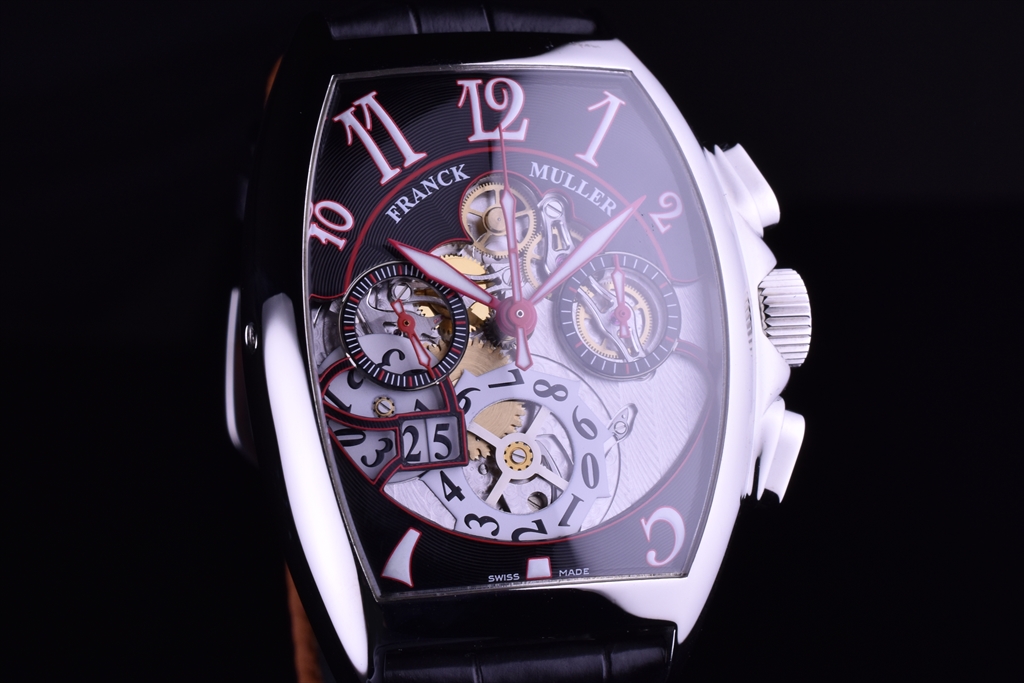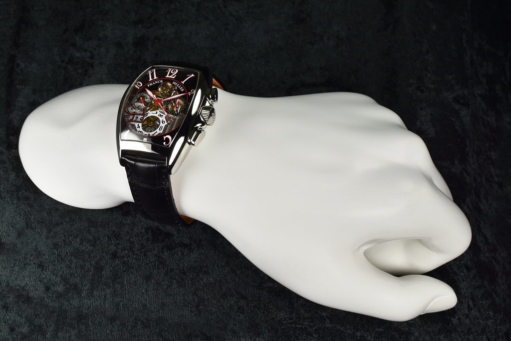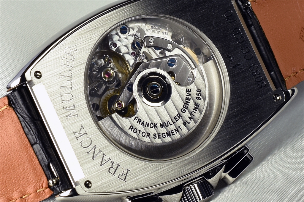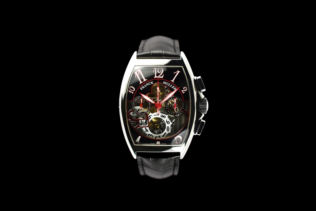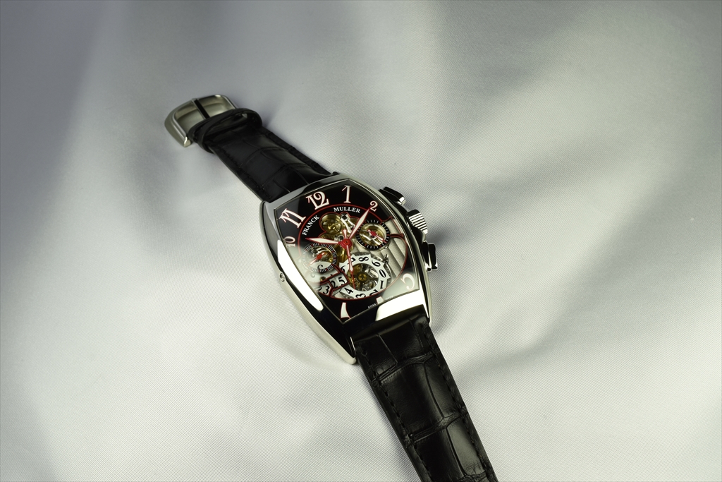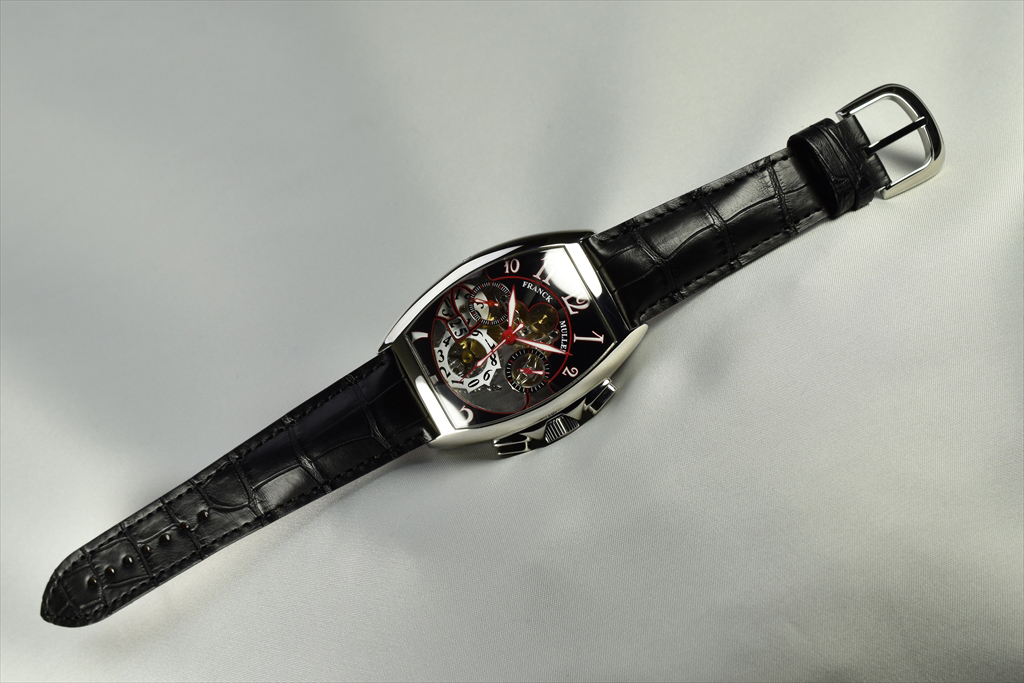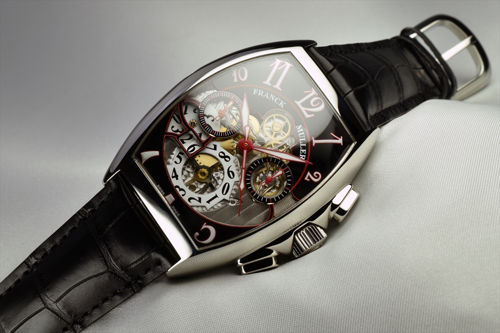そのような時代背景を尻目に毎年のように世界初の機構を発表するフランク ミュラーは、世界初のクロノグラフ機構をいくつも開発してきました。クロノグラフの開発を得意とする複雑機構の巨匠だからこそ、あえて文字盤に閉ざされた秘密の構造美にさらけ出し、高級仕上げを施すことで、構造美を見せるクロノグラフの新たな表現方法に至っています。