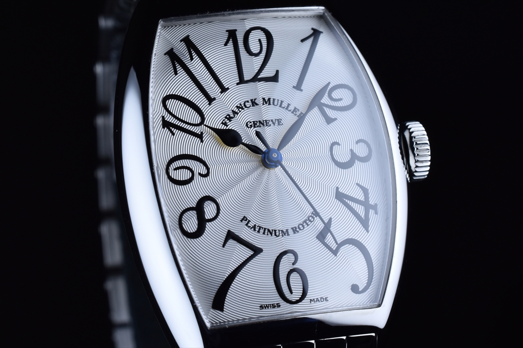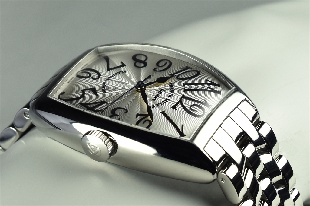 典型的な20世紀のアールデコ様式のデザインを蘇らせながら、現代のスタイリッシュなデザイン感覚をも併せ持つトノウ カーベックスは、裏蓋、文字盤、サファイアガラスまでもケースに合わせて正確に仕上げるため、極めて精巧な工作技術が要求されます。こちらのモデルはギョウシェが入った白の文字盤の上に配置された華奢なビザン数字のインデックスと繊細なラインのスペード針が上品さを醸し出しているフランク ミュラーの代表的作品です。