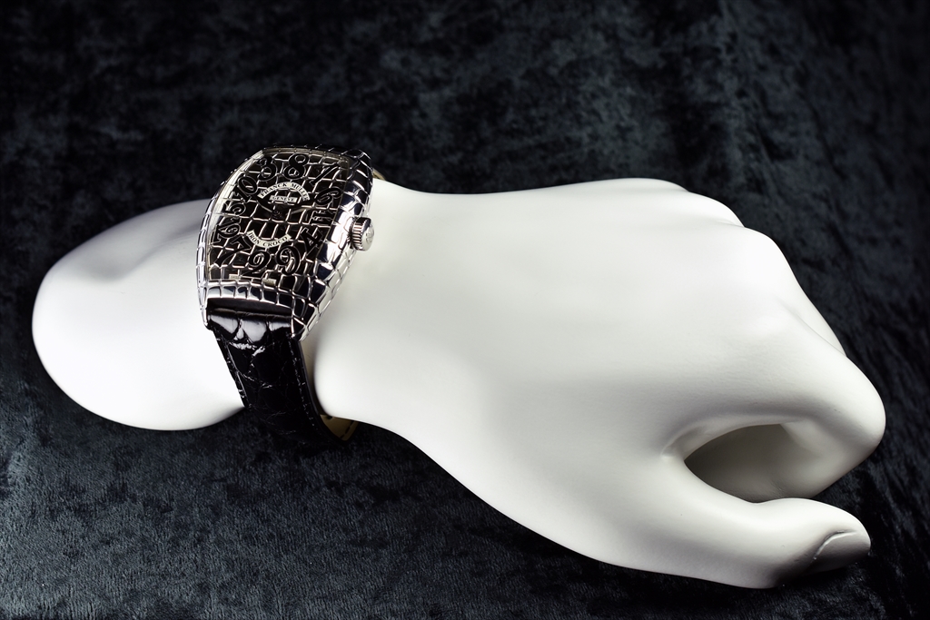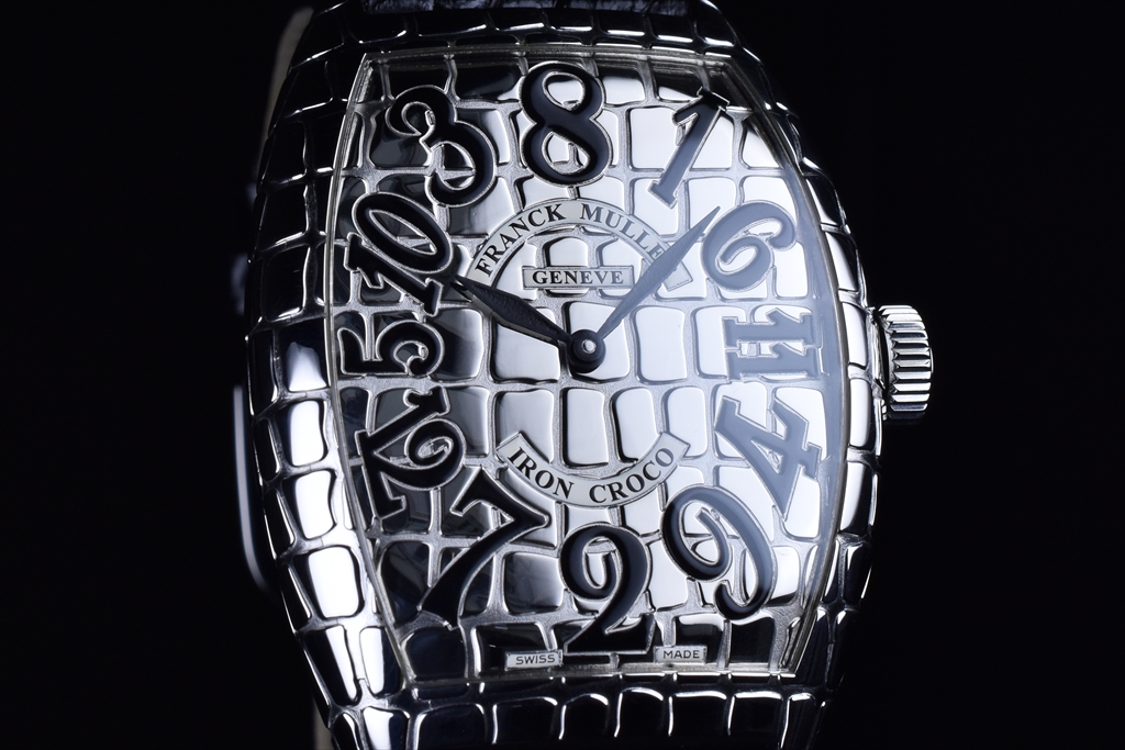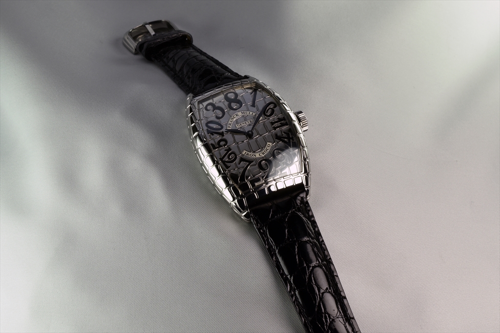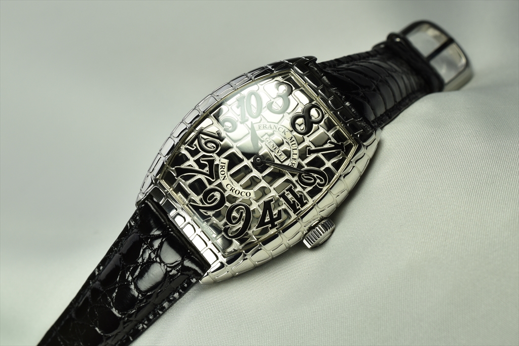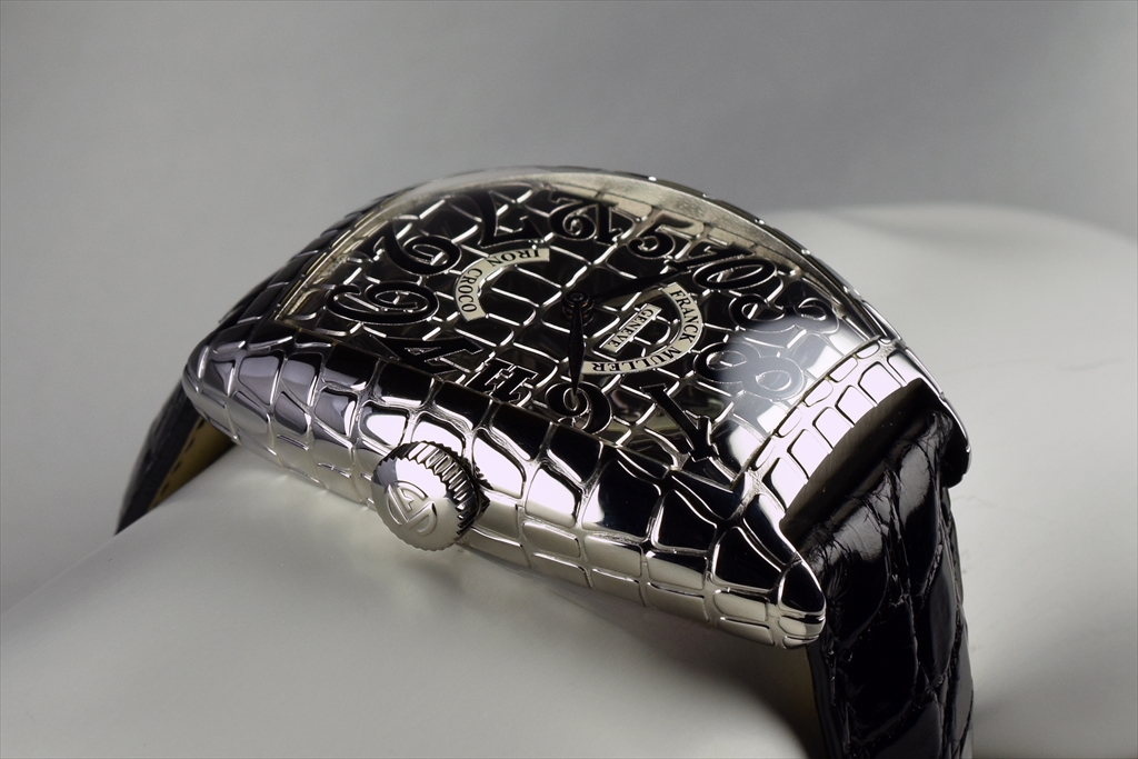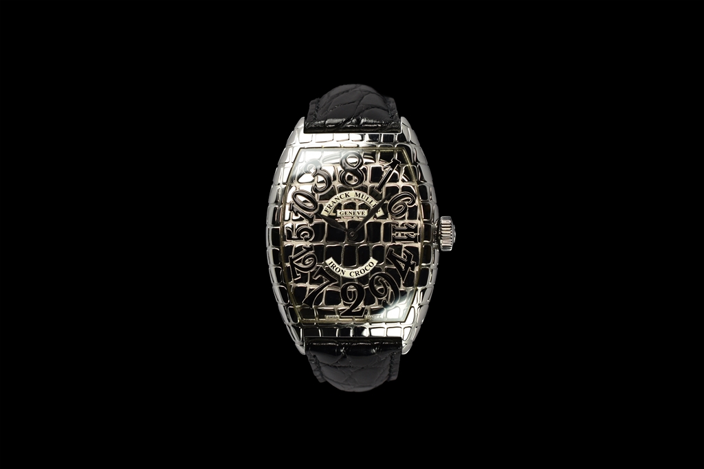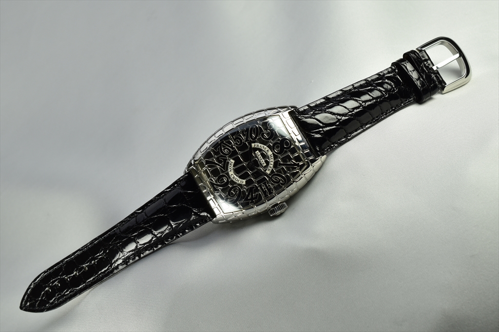 クロコシリーズのポイントは、遠目で見るとシンプルで美しい通常のトノウ カーベックスモデルにしか見えない点にあります。つまりカジュアルにもスーツにも似合う汎用性があります。ところがぐっと近づいて見ると、そのクロコダイルの斑から発せられる生命力あふれるビジュアルインパクトに目を奪われてしまいます。さらにもっと近づけば、斑模様の美しさやストラップにまで同様の斑模様部分を使用するというフランク ミュラーらしいこだわりに気がつくでしょう。この繊細かつ大胆な遊び心は時計業界に一石を投じたといっても過言ではないでしょう。