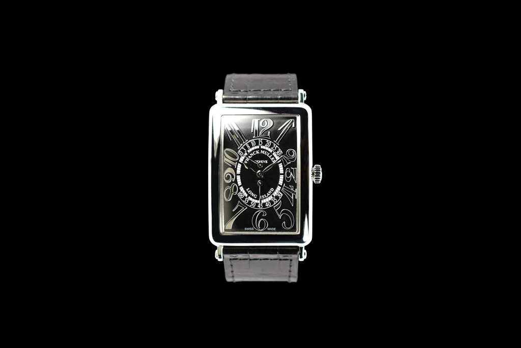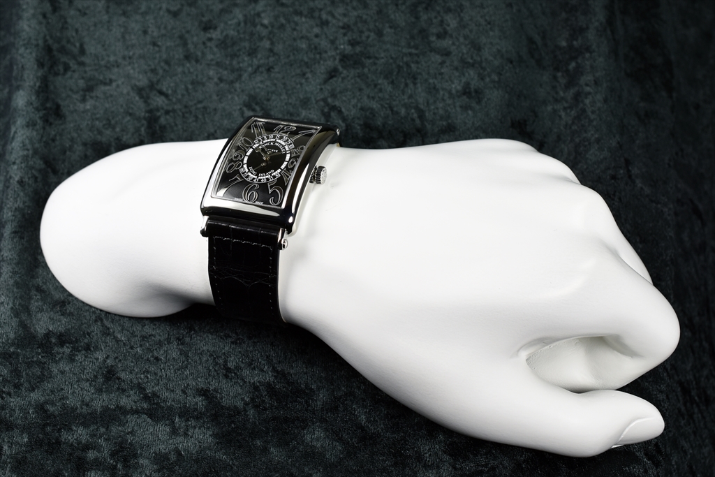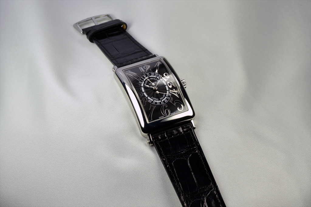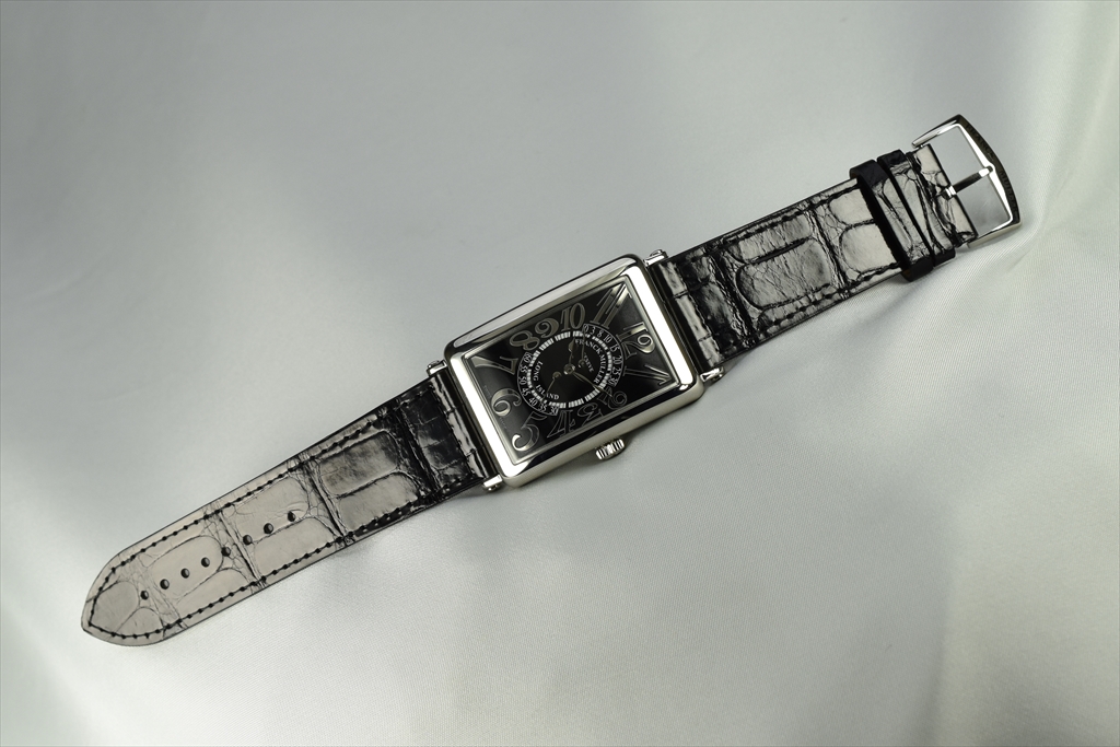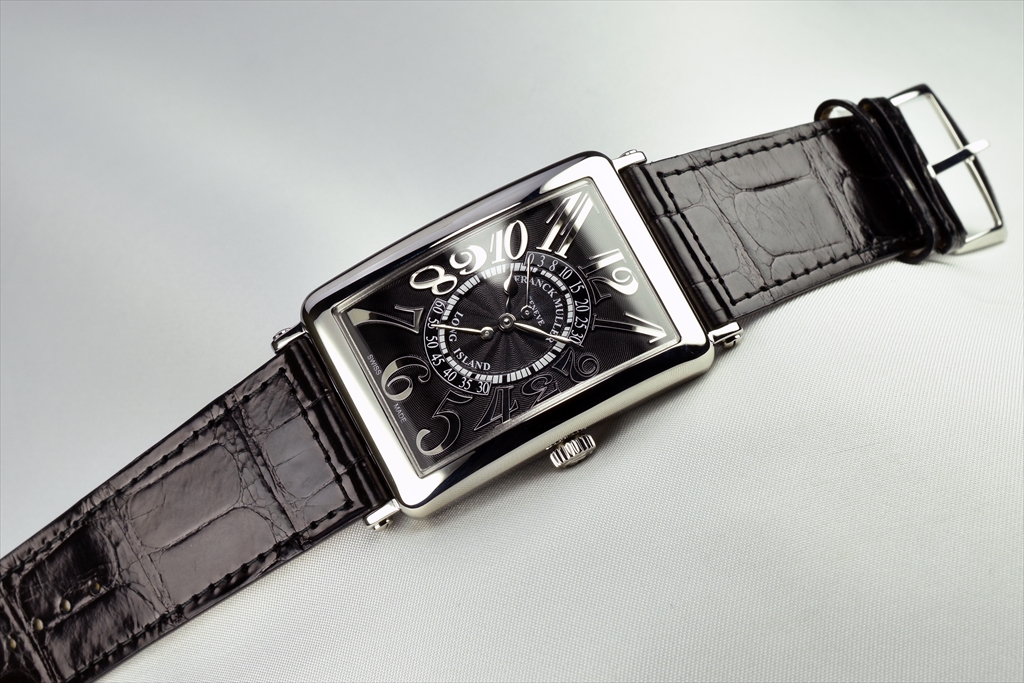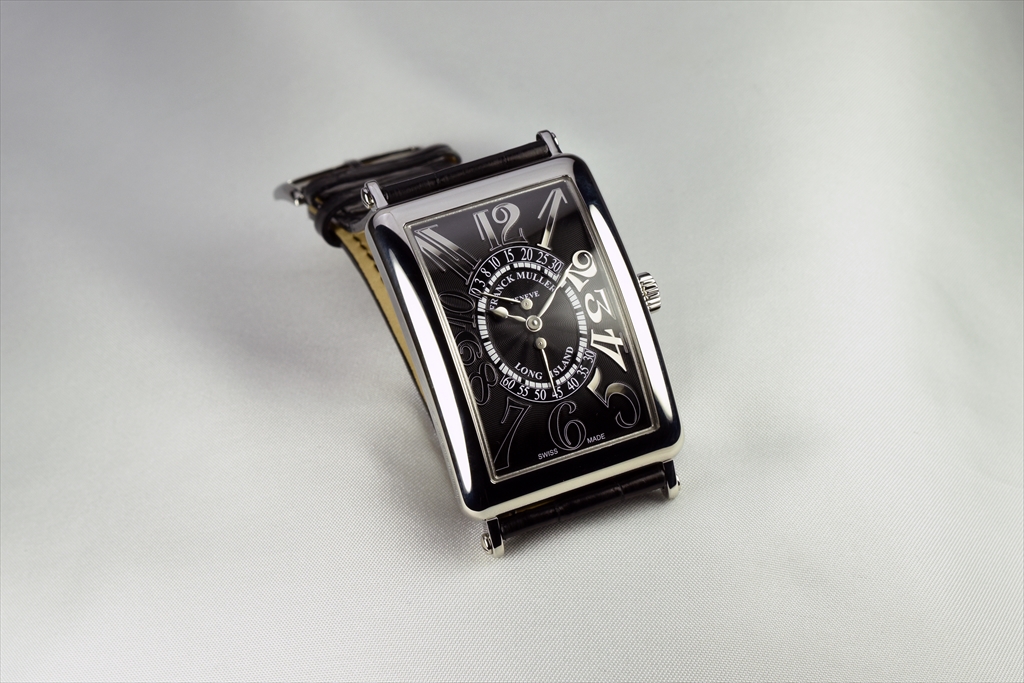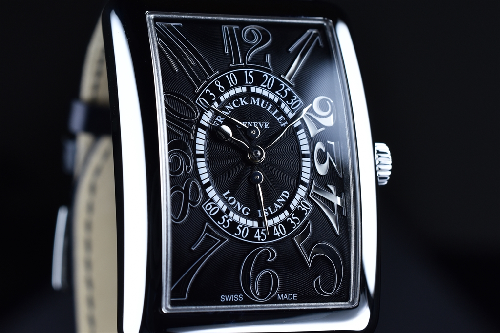 1100DSRRELLTD AC Black "ロングアイランド ビーレトログラード セコンド レリーフ" です。"ビーレトログラード セコンド"は、フランク ミュラーが2000年に発表したユニークで独創的な時間表現を持ったモデルです。通常は1分間(60秒)で円周を回る秒針を、2本の針で30秒づつに分割し、第一の針は0〜30秒を、第二の針が30〜60秒までを表し、それぞれの針がレトログラード(フライバック)によって表示するという、世界初の方式のムーブメントを搭載しています。