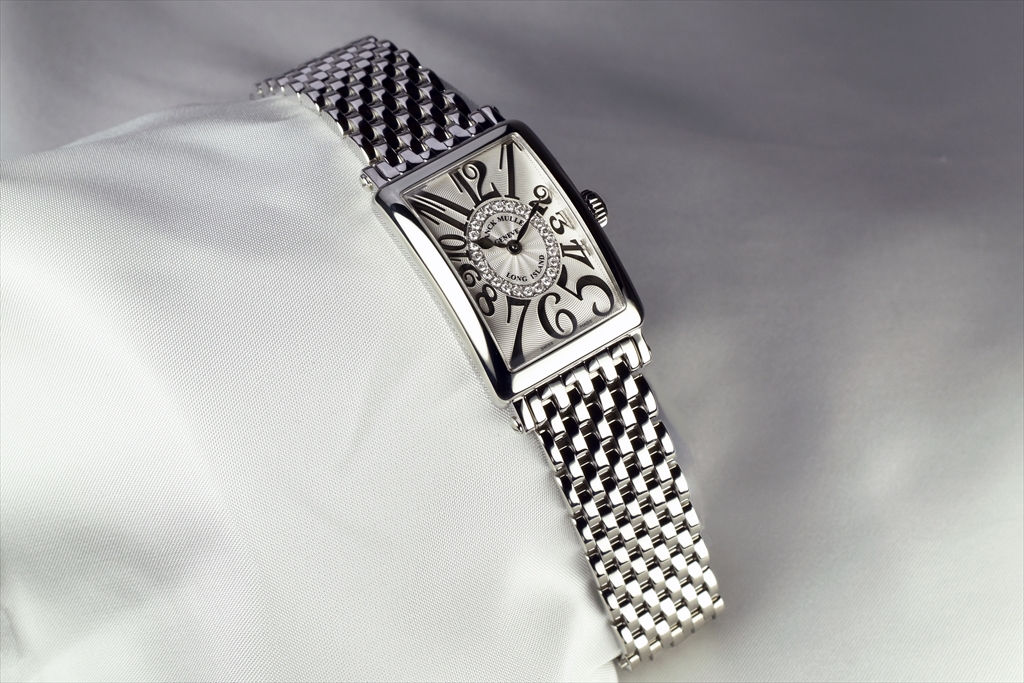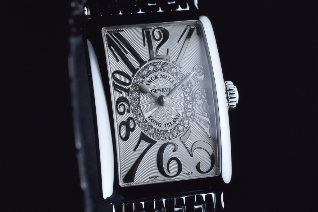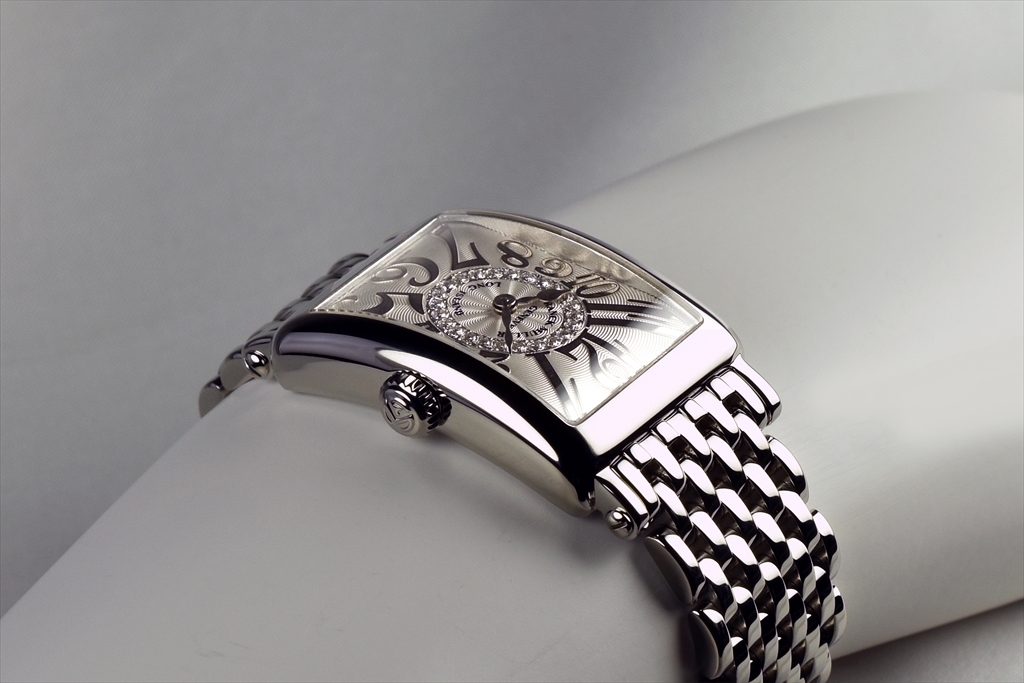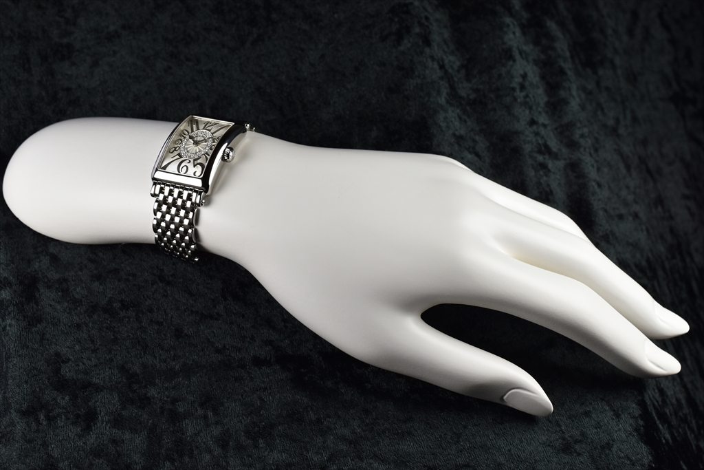 秒の刻み(ミニッツレコード)にダイヤモンドが敷き詰めれた本作品は、レリーフ状に立ち上がったビザン数字の陰影と一体化し、小ぶりな時計ながらもフランク ミュラー独自の個性が引き立ちます。